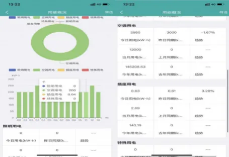 分项用能概况将项目下某能源节点对应的分项用能以柱状图、饼图、表格数据的形式呈