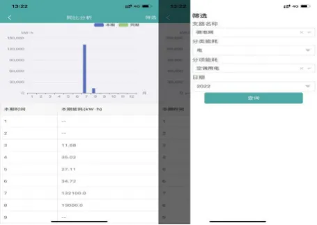 并以柱状图和报表的形式展示,用户可以通过回路名称、年份、分类能耗进行筛选查询