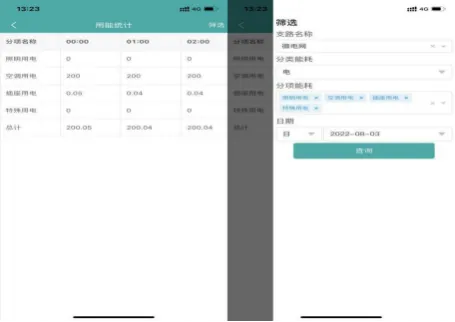 现。用户根据能源节点、分类能耗,日期查询分项用能,分类能耗包括“电”和“水”