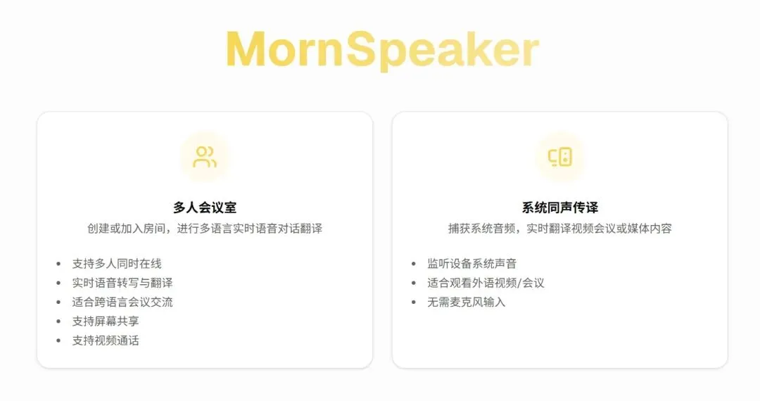 不管是国际商务会议、海外求职面试,还是跨境团队日常沟通,有了 MornSpeaker,再也不用等翻译、不用怕误解,效率直接翻倍!海外学习的课堂交流、国际交流的日常畅谈,都能靠这个在线翻译会议室实现零障碍对接。
