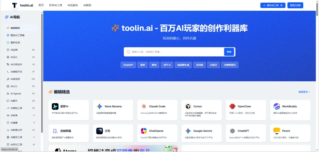 网站首页的 “编辑精选” ,简直就是AI界的“热搜榜”。什么字节跳动的“即梦AI”、谷歌的“Nano Banana”、Anthropic的“Claude Code”……最火的、最新的,全给你捞出来了。不用自己满世界刷,看它就够了。
