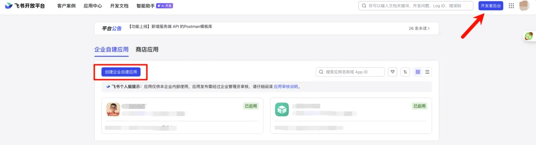 访问飞书开放平台,进入“开发者后台”,点击”创建企业自建应用”。填个名字(比如”MaxClaw办公助手”),保存就行。