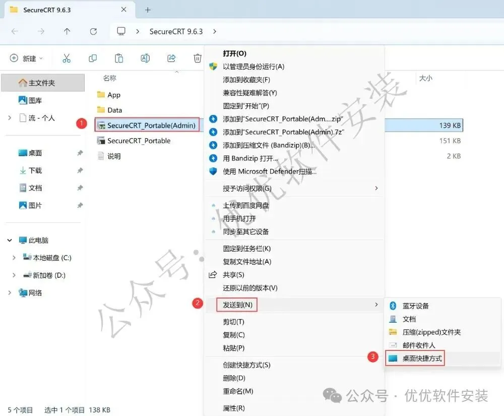 3、找到【SecureCRT_Portable(Admin)】程序,右键依次点击【显示更多选项】、【发送到】、【桌面快捷方式】,完成软件桌面快捷方式的创建
