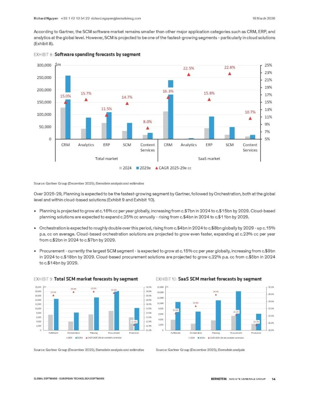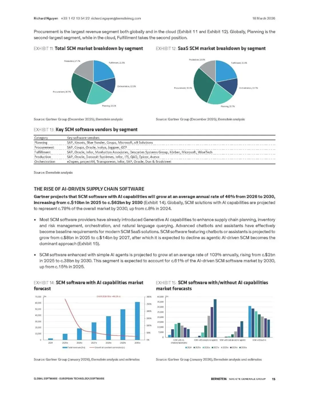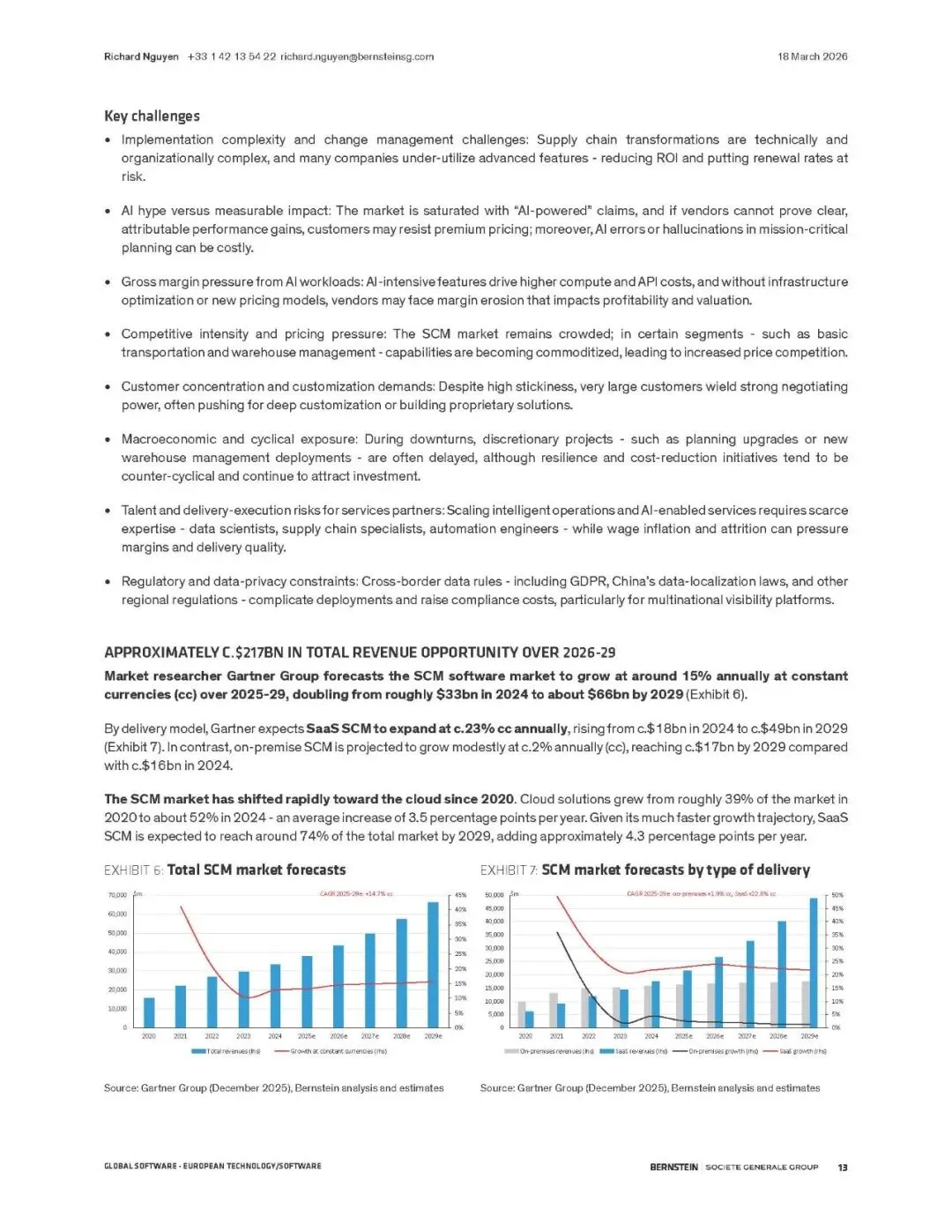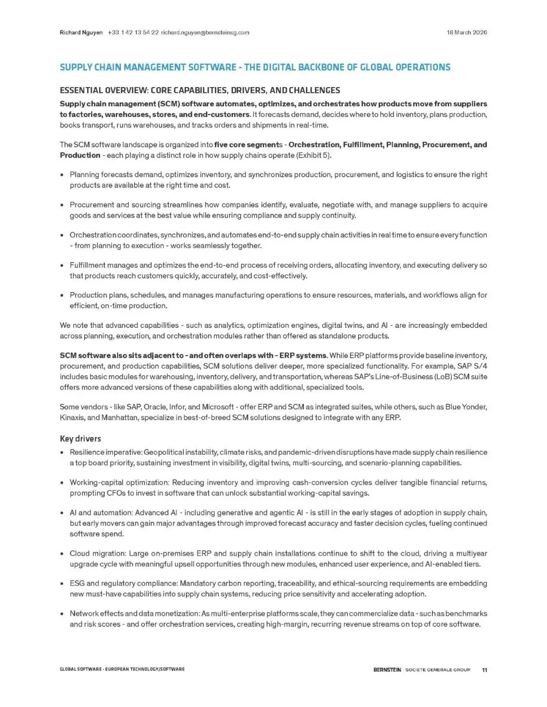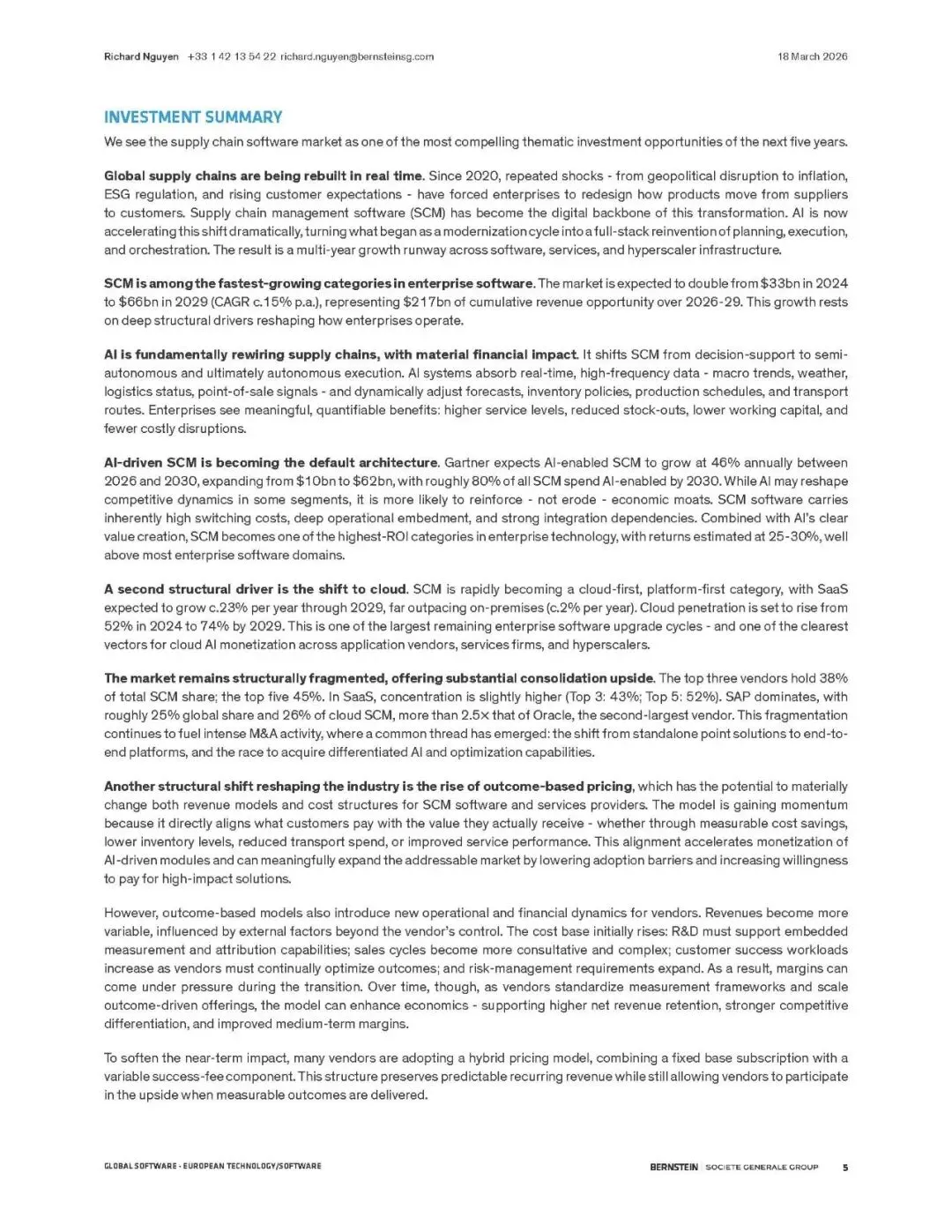 伯恩斯坦报告指出,供应链管理(SCM)软件正迎来由AI驱动的超级周期。全球供应链因地缘、通胀和ESG要求而重构,SCM软件成为核心数字支柱。预计市场规模将从2024年的330亿美元翻倍至2029年的660亿美元,2026-2029年累计收入机会达2170亿美元。
