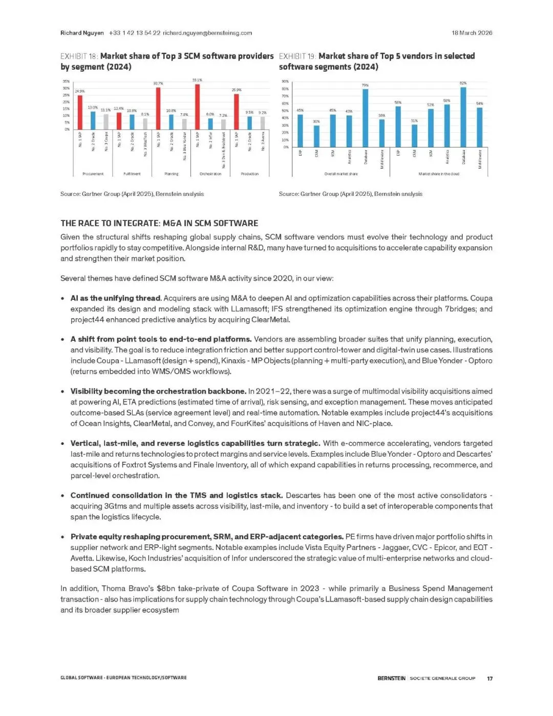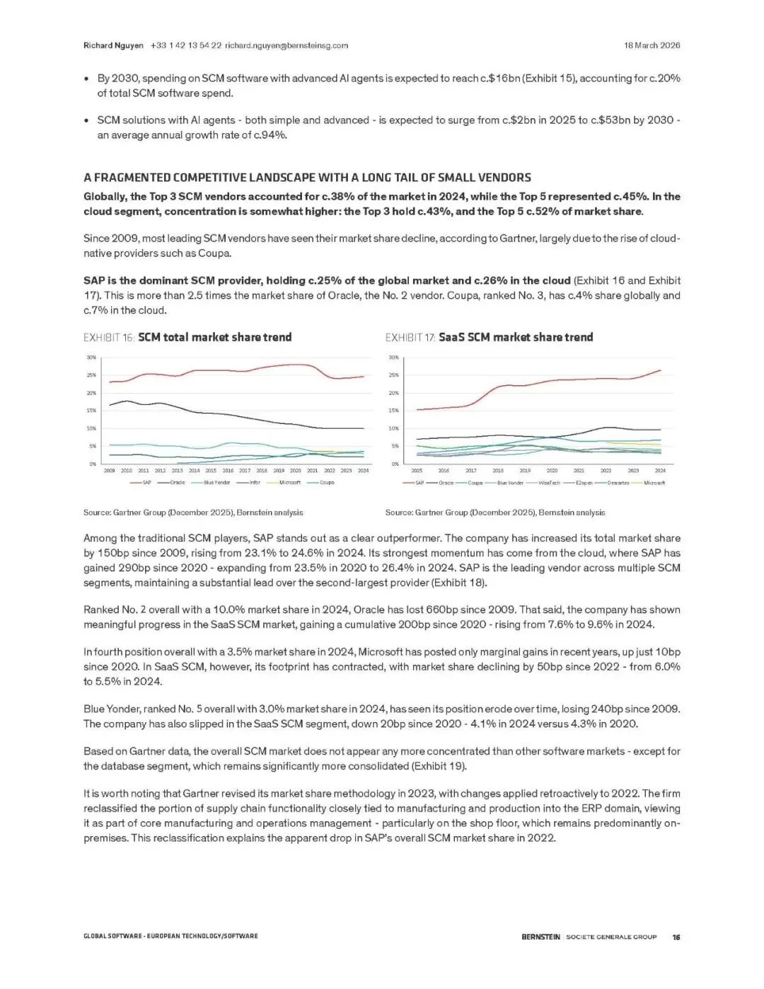 市场竞争仍较分散,SAP以约25%的份额领先,优势显著。IT服务商(如凯捷)因执行复杂转型而成为重要受益者。定价模式正转向基于成果的模式,虽带来收入波动,但能更好实现AI价值变现。