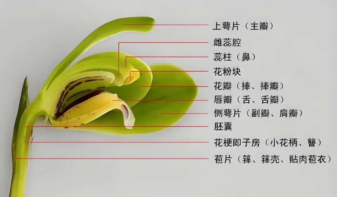 人有双性兼具之体,兰有雌雄合蕊之柱:大部分兰花的花蕊,一反惯常的独立结构,雄蕊与雌蕊完全长在一起,变成一根柱子——合蕊柱。