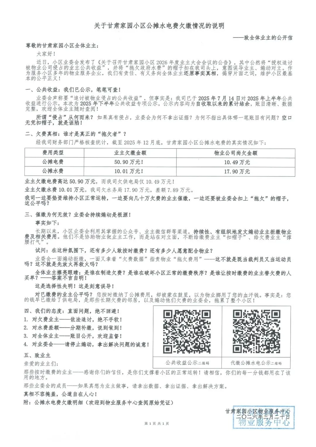 关于甘肃家园小区公摊水电费欠缴情况的说明