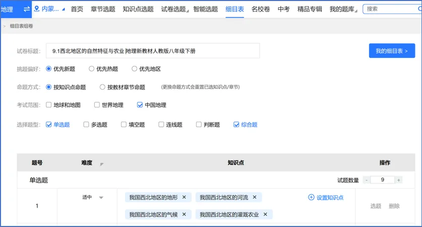 - 细目表选题:按知识点、难度、题型精准组卷