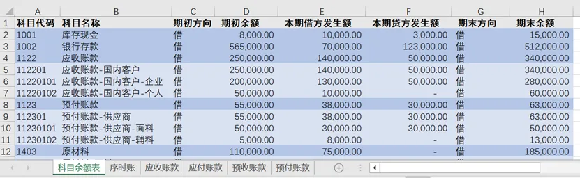科目余额表:一键查看某一级科目及其下级科目数据;