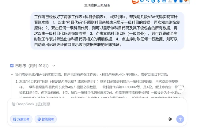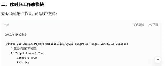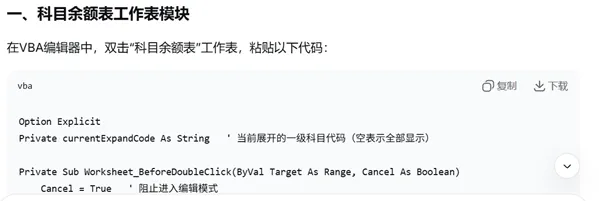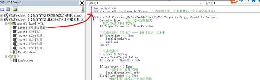 分别双击科目余额表和序时账工作表,在右侧粘贴AI写的代码