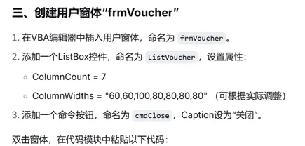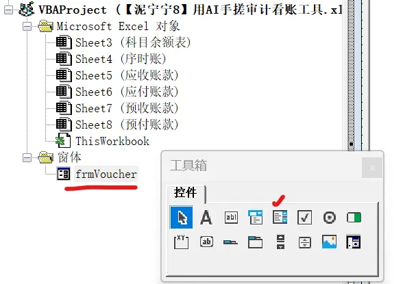 同时<序时账>工作表需要跳出窗体显示完整的记账凭证,AI告诉要创建窗体(就是跳出来的窗口)及相关控件(就是窗口上承载数据的一些列表、按钮等),并且给出窗体对应的代码