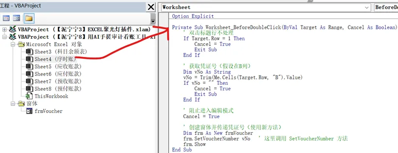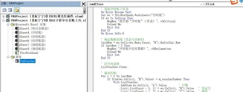 最后选中窗体frmvoucher点击鼠标右键选择查看代码,将AI写的窗体代码粘贴到右侧