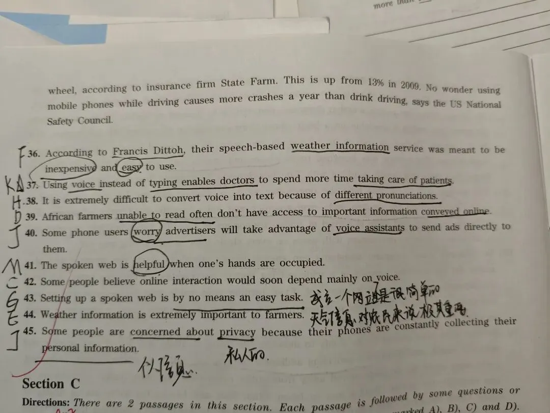 ③接下来去读每一段的第一二句,大概率是答案,这里一般能做出6题!!剩下的选项就去读每段的段尾和段中,这里一般有两题