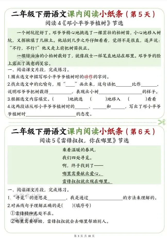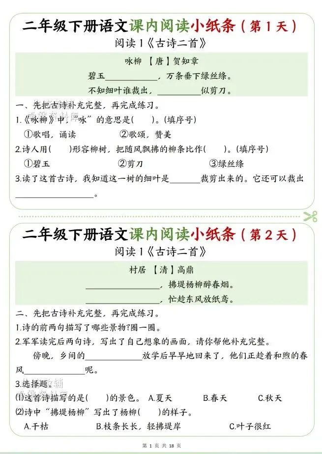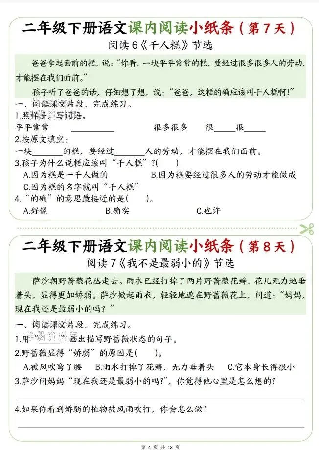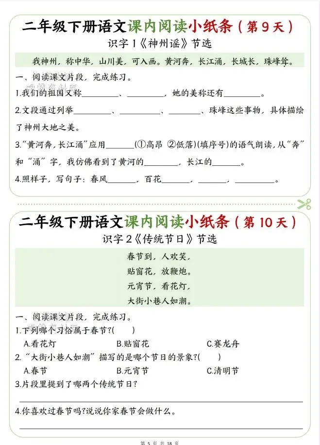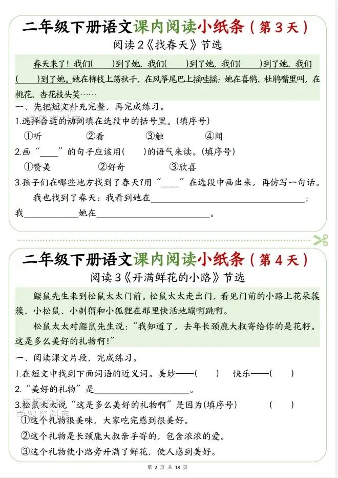 今天给大家整理了二年级语文下册课内阅读小纸条,转发给朋友或班级群,受益更多人,帮助孩子学习!
