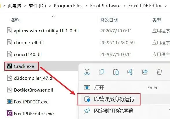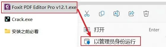 2、选中”Foxit PDF Editor Pro v12.1.exe“右键以管理员身份运行