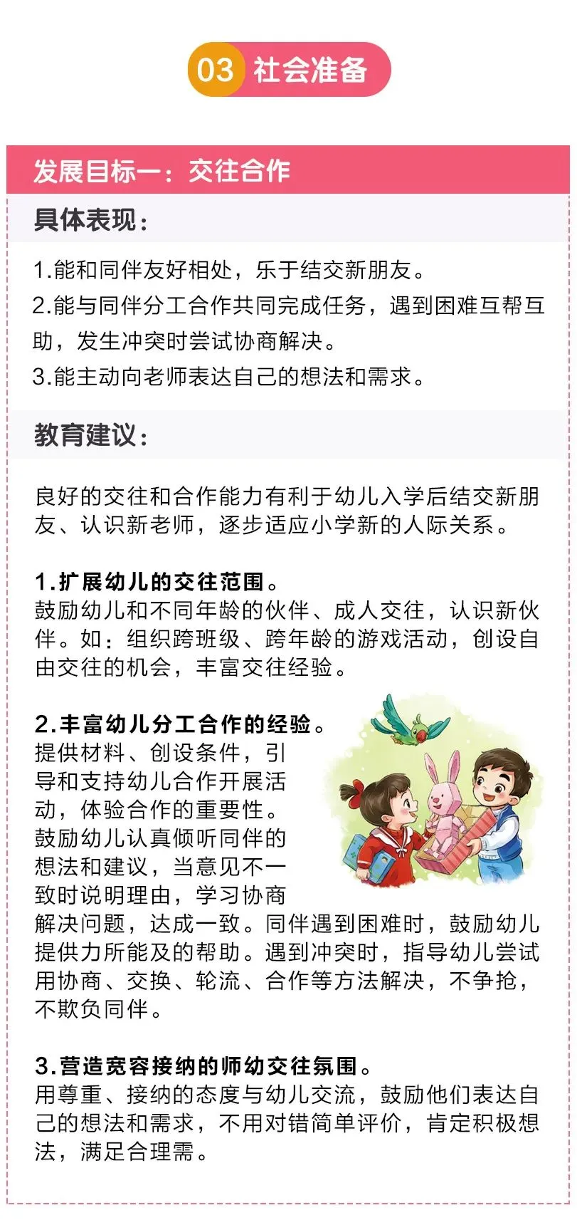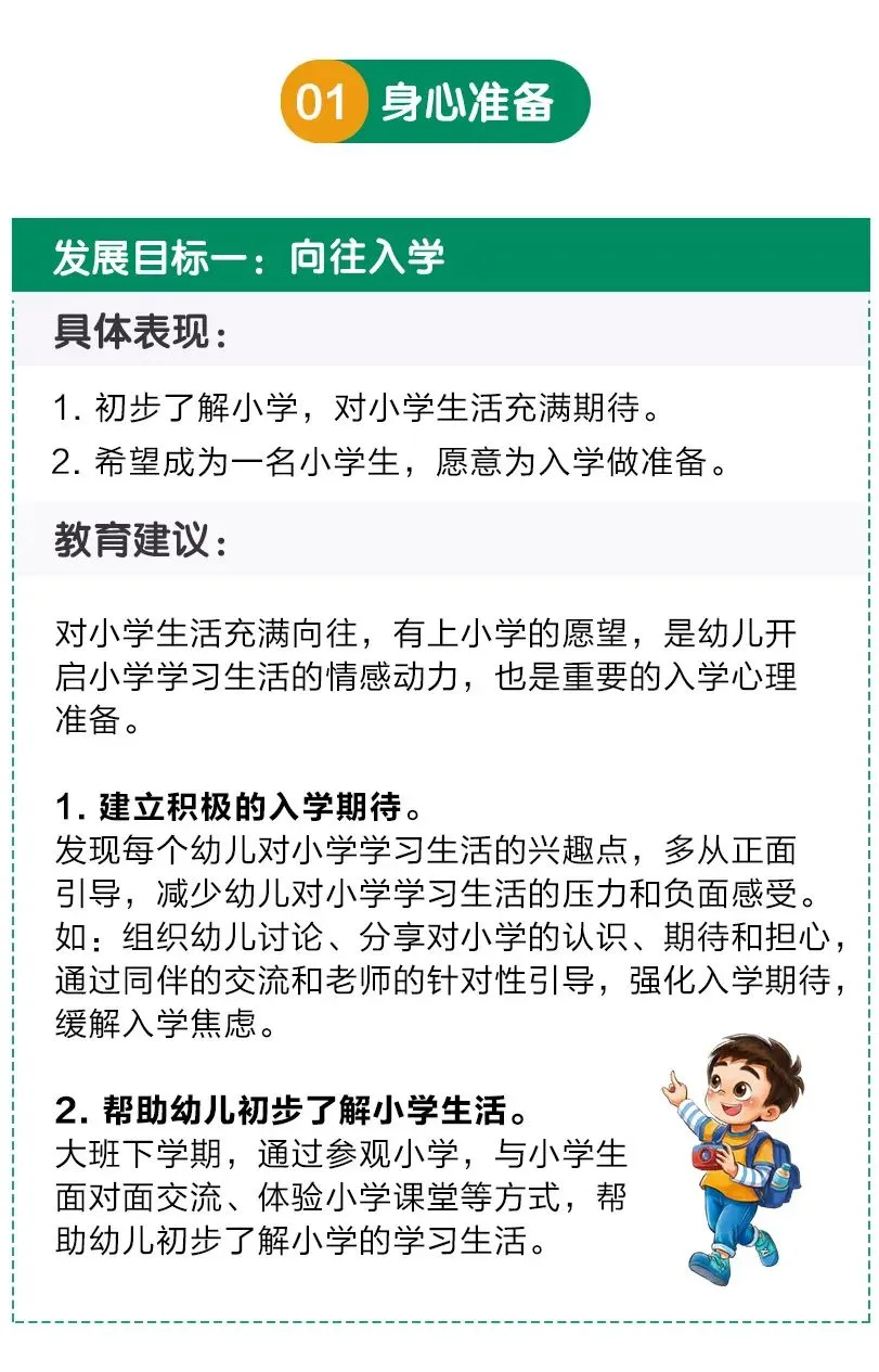《幼儿园入学准备教育指导要点》围绕幼升小所需的关键素质,对幼儿的身心准备、生活准备、社会准备和学习准备提出了具体、可操作的指导。如何帮孩子做好幼小衔接?老师和家长赶紧收藏学习吧~
