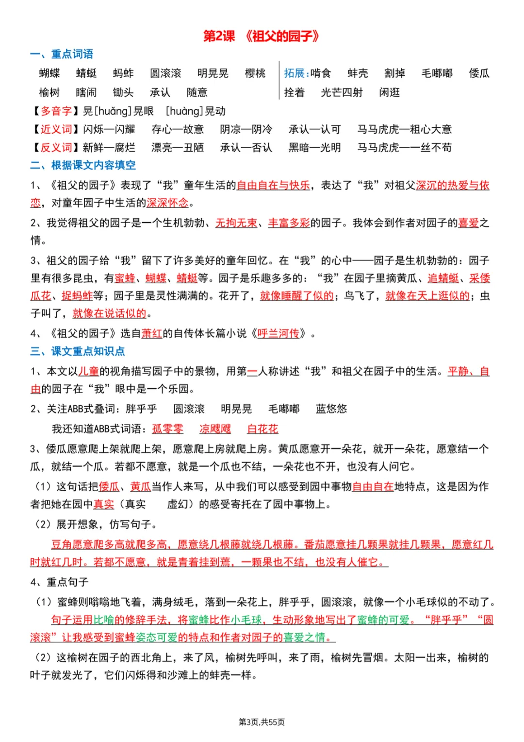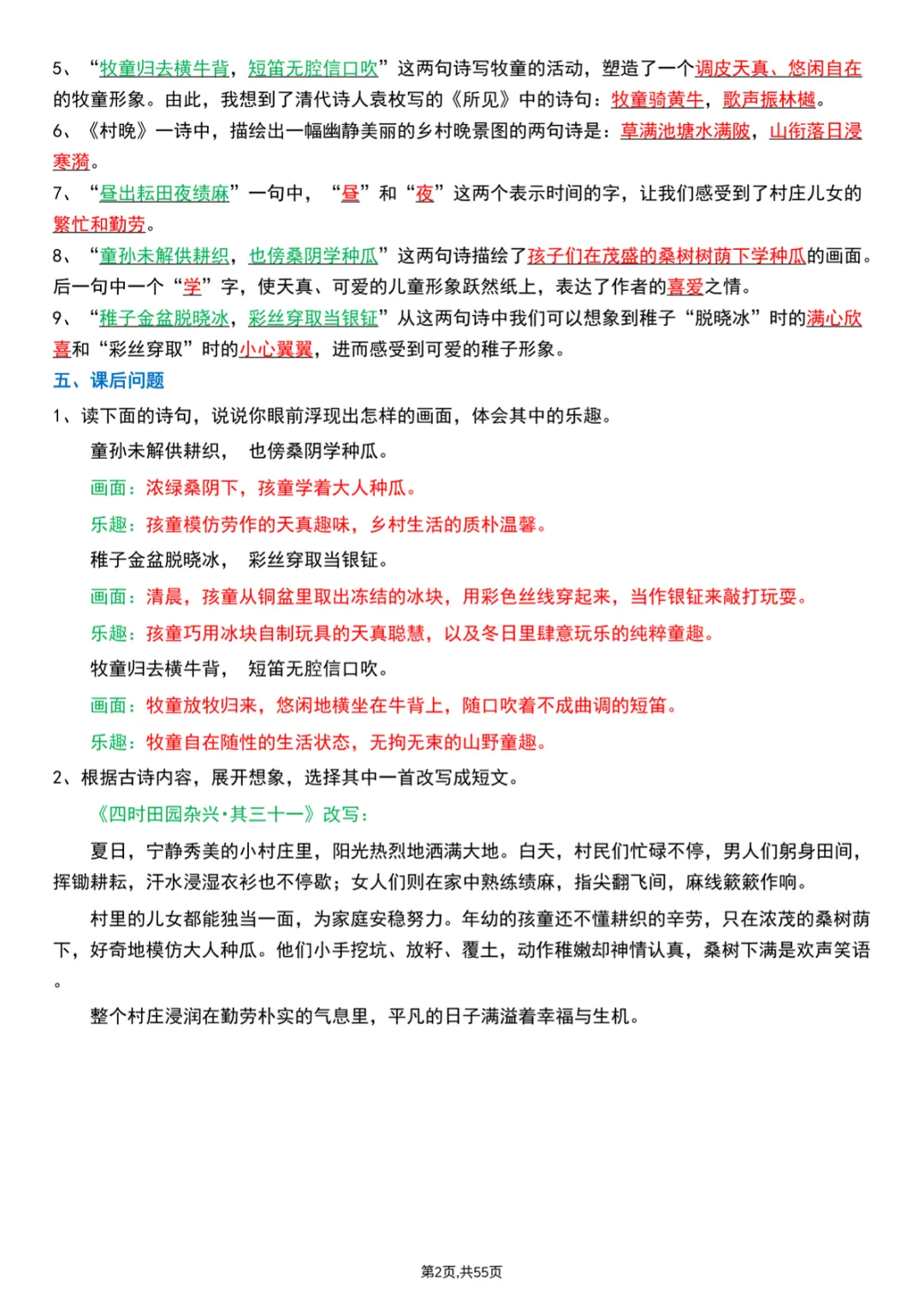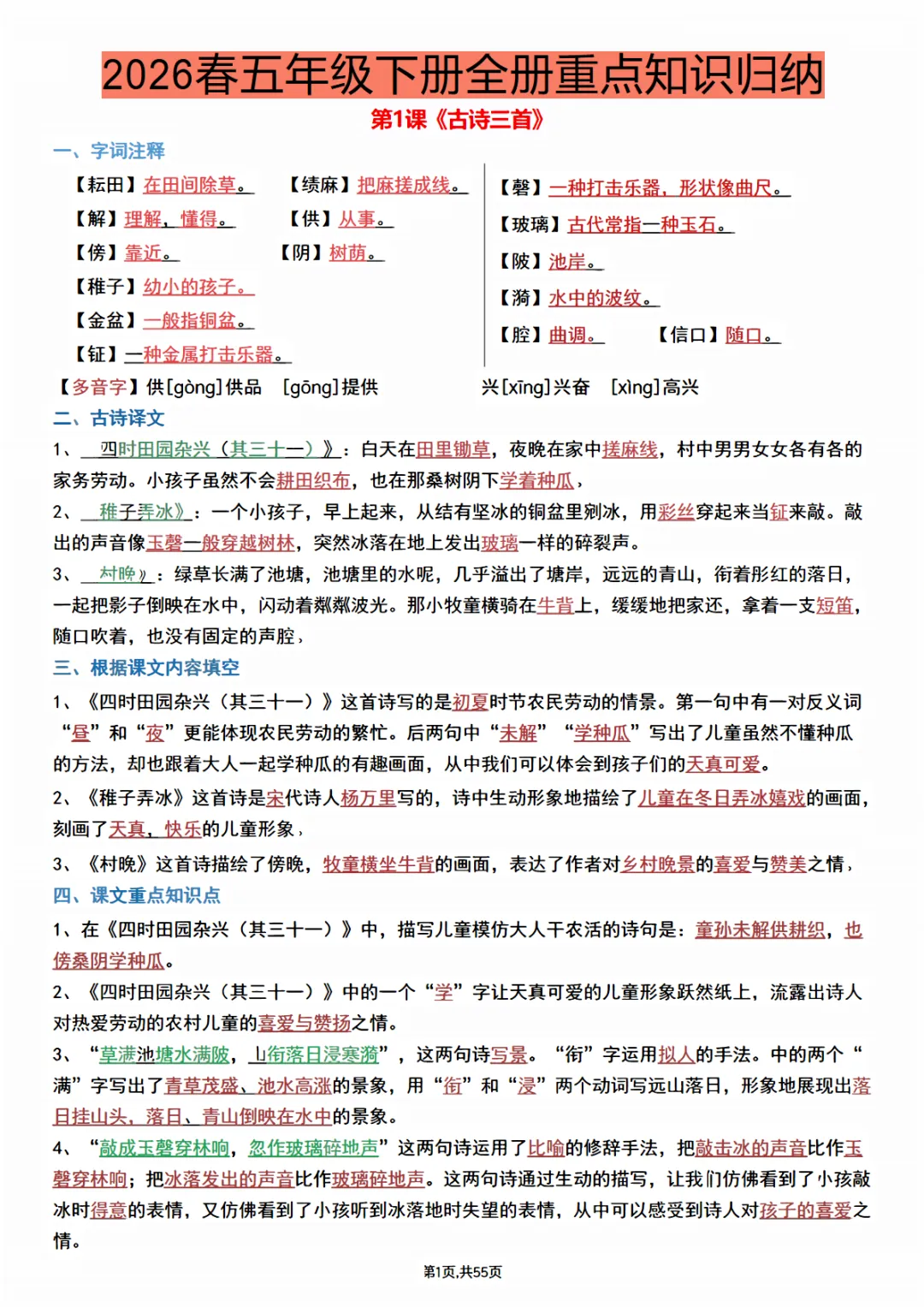 【免费下载】五年级(下)语文 每课重点知识归纳,PDF电子版,可打印
