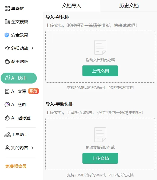 这里我们选择AI快排,导入自己写好的word文档,大概30秒的时间,系统就会自动根据我们文档中的内容,选择合适的模板,并且进行排版。