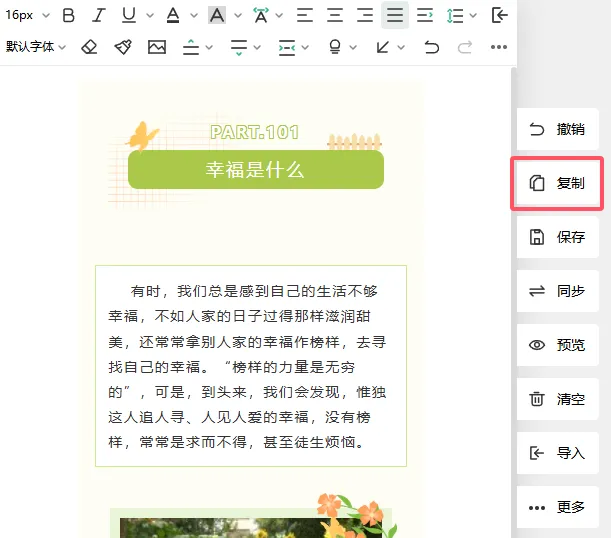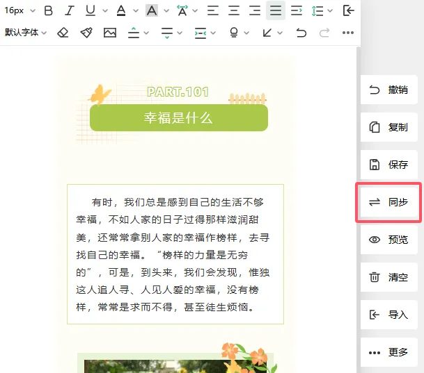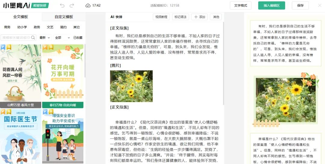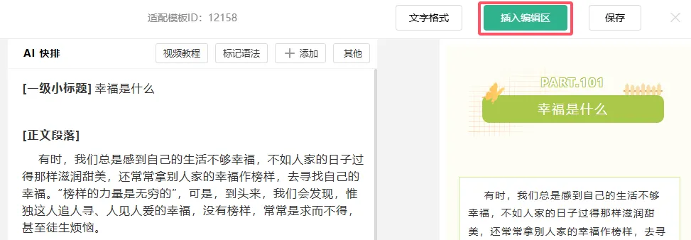 排版完成之后,点击右上角的插入编辑区按钮,就可以将排版好的内容添加到编辑器中。