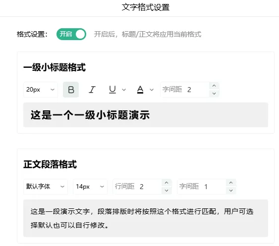如果想要修改模板中的文字格式,可以点击右上角的文字格式按钮,然后打开开关,就可以看到一级小标题和正文段落格式设置的入口。