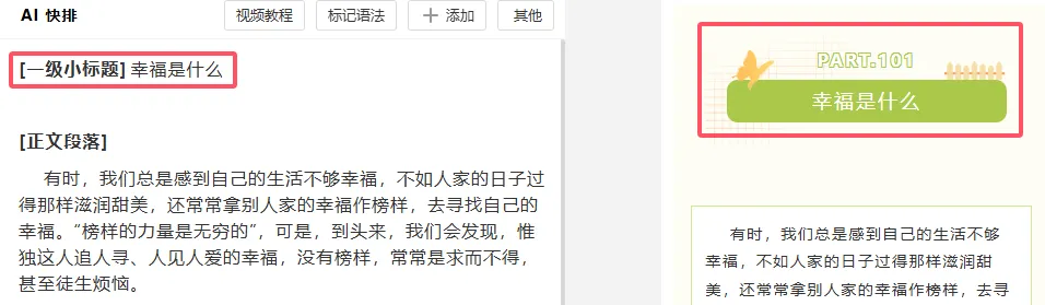 如果想要在已经排版好的内容中,添加新的内容。只需要将新的内容复制到中间AI快排编辑器中,然后用语法标记出内容属于哪一块,系统就会自动将内容变成对应的样式。