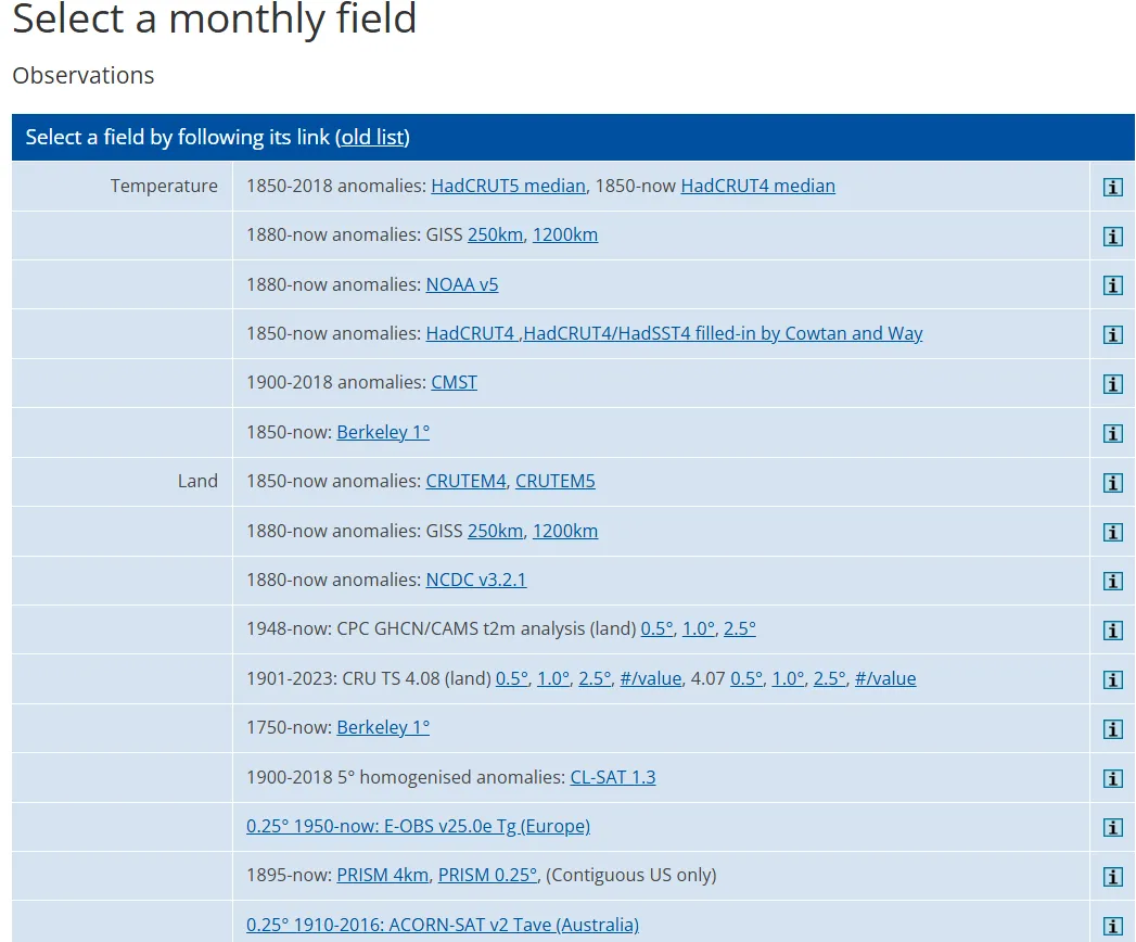 网站中有多种数据可以下载:Temperature(温度)、Land(陆地)、Tmax、Ground frost days(地面霜冻天数)、Tmax-Tmin(DTR)、SST(海表温度)、Air Temperature(气温)、Lower Troposphere(下对流层)、Precipitation(降水)、OLR、Sea-level Pressure(海平面气压)、Surface Solar Radiation(地表太阳辐射)、Cloud pressure(云压)、Snow cover(积雪)、Permafrost(永冻层)、Sea ice concentration(海冰密集度)、Sea ice cover(海冰覆盖)、Ocean salinity(海洋盐度)、Sea surface height(海面高度)、Heat content(热含量)、Ocean mean temperature(海洋平均温度)、Gravity(重力,引力)、Z20、Wind(风)、Wind stress(风应力)、Wind speed(风速)、Tropical cyclones(热带气旋)、Ozone concentration(臭氧浓度)、Aerosol(气溶胶)、Emissions(排放物)、Vegetation index(植被指数)、Drought index(干旱指数)、Soil moisture(土壤湿度)、Potential evaporation(潜在蒸发量)、Runoff、Discharge、Humidity(湿度)、Vapour pressure(蒸气压)、Max vapour pressure deficit(最大蒸气压差)等等。