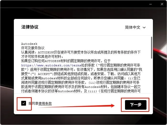 3.勾选【我同意使用条款】,点击【下一步】