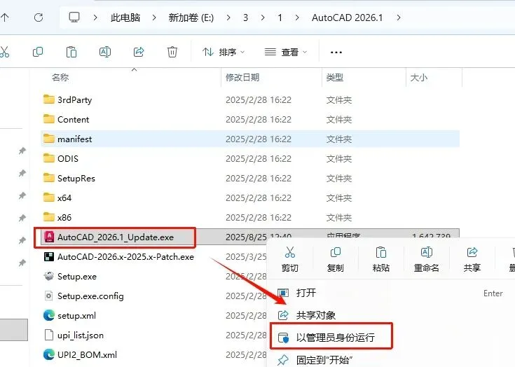 7.打开解压后的【CAD2026】文件夹,鼠标右击【AtuoCAD_2026.1_Update】,点击【以管理员身份运行】
