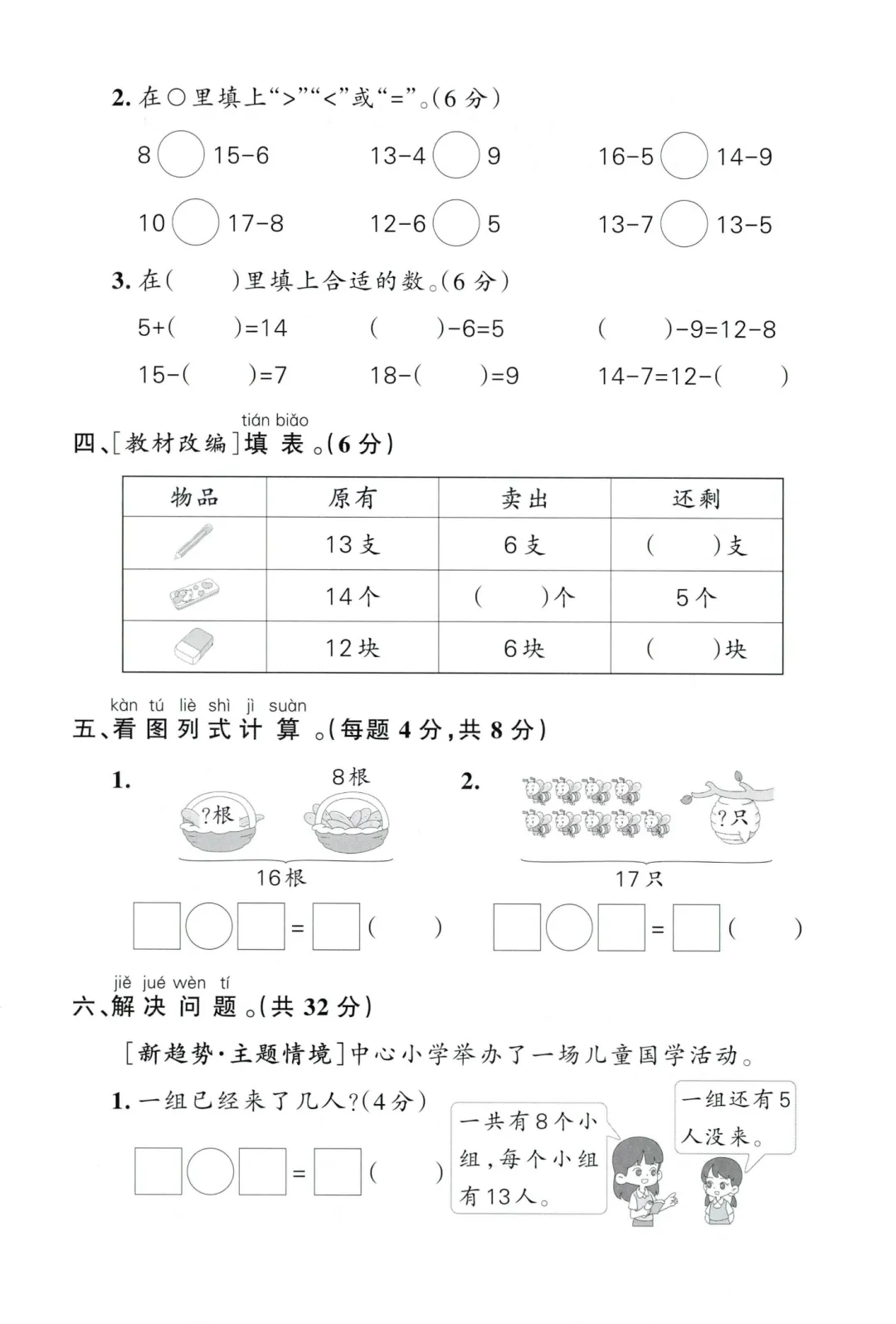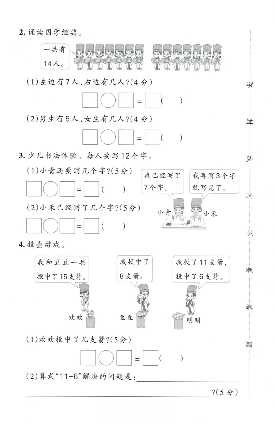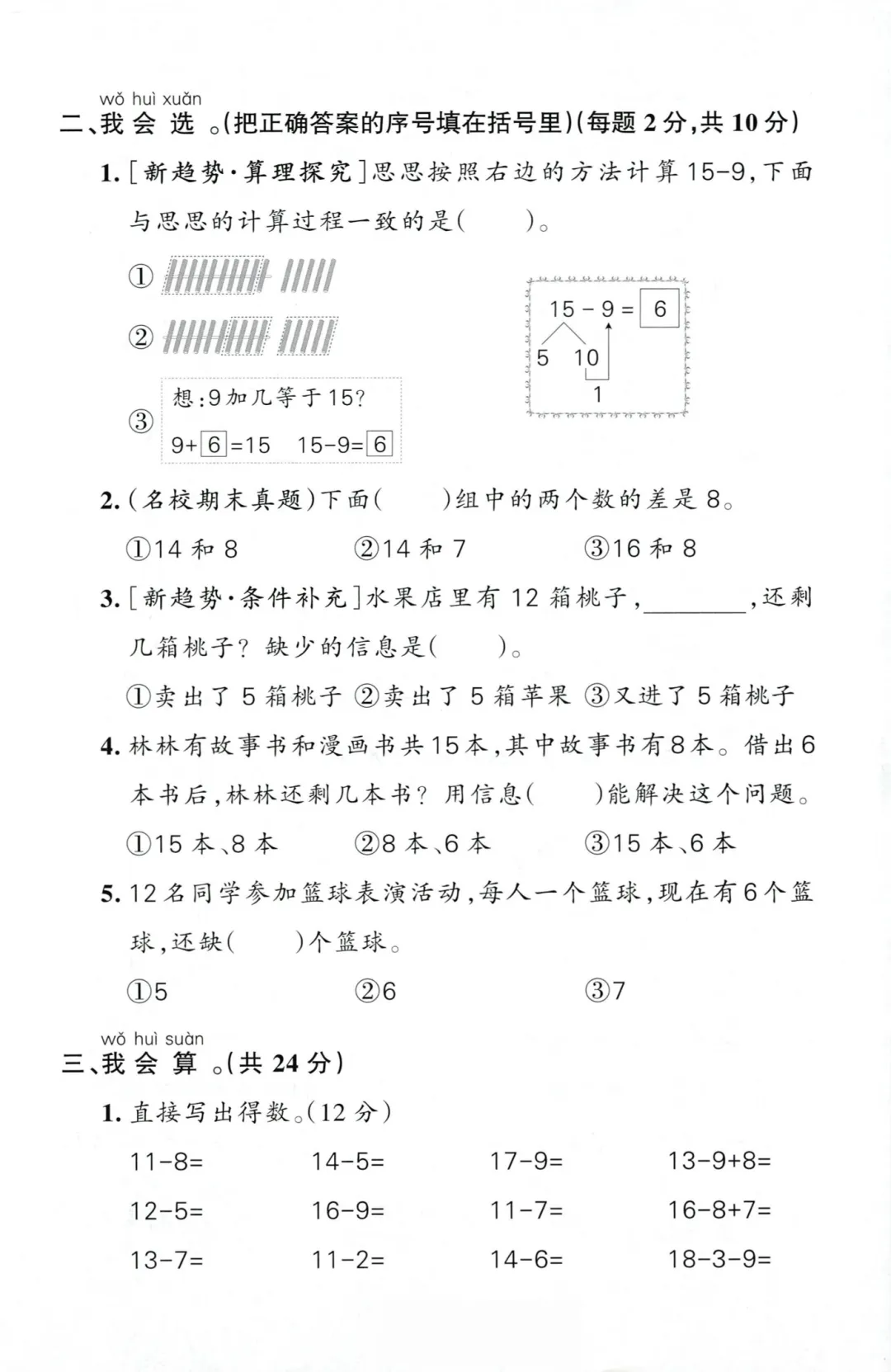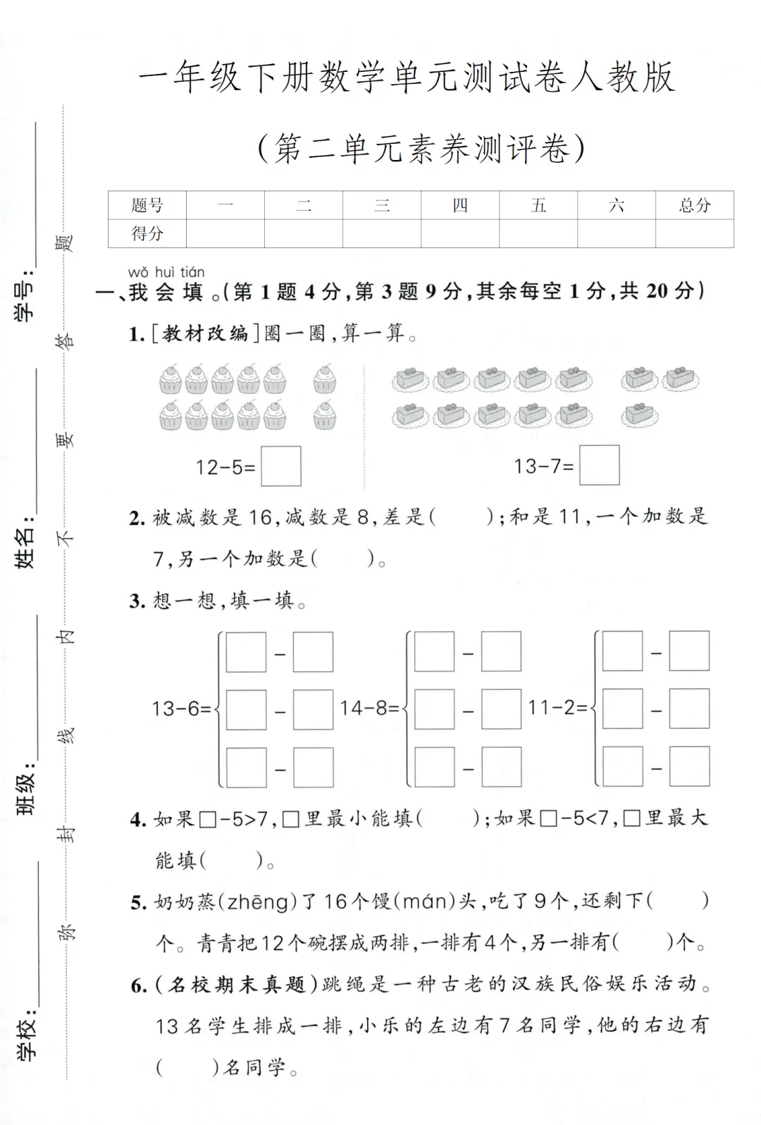 【免费下载】一年级(下)数学 第二单元综合素养卷,PDF电子版,可打印