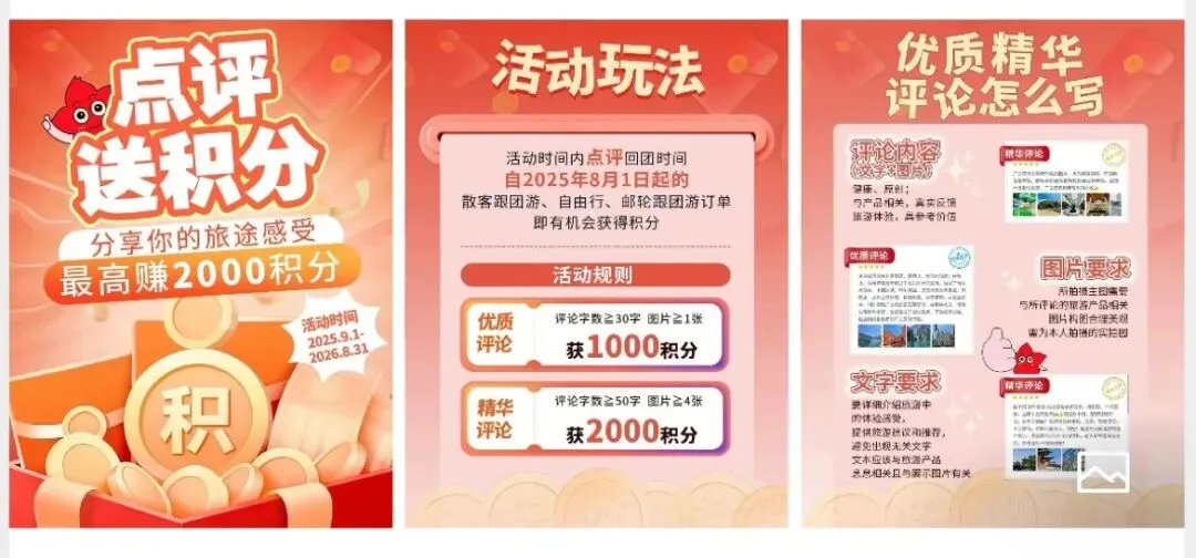 分享真实旅游感受,赢取丰厚积分!积分可直接当钱花,抵现省旅费,更能兑换多种好礼。😘点击图片查看