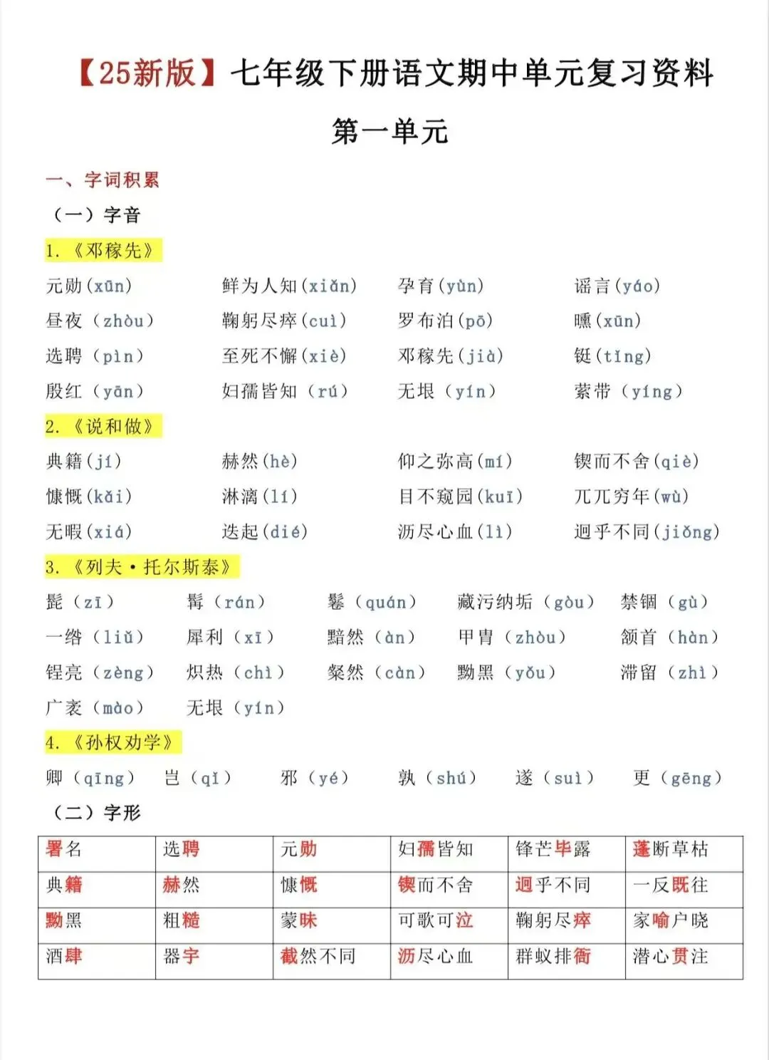 七年级下册语文期中单元复习资料/电子版可打印 以下为部分截图,具体看完整PDF文件 (温馨提示:文末有电子版领取方式) 领取完整电子版: ①:点一点右下角的“赞”和“在看”,感谢支持! ②:点击“关注”,回复资料领取