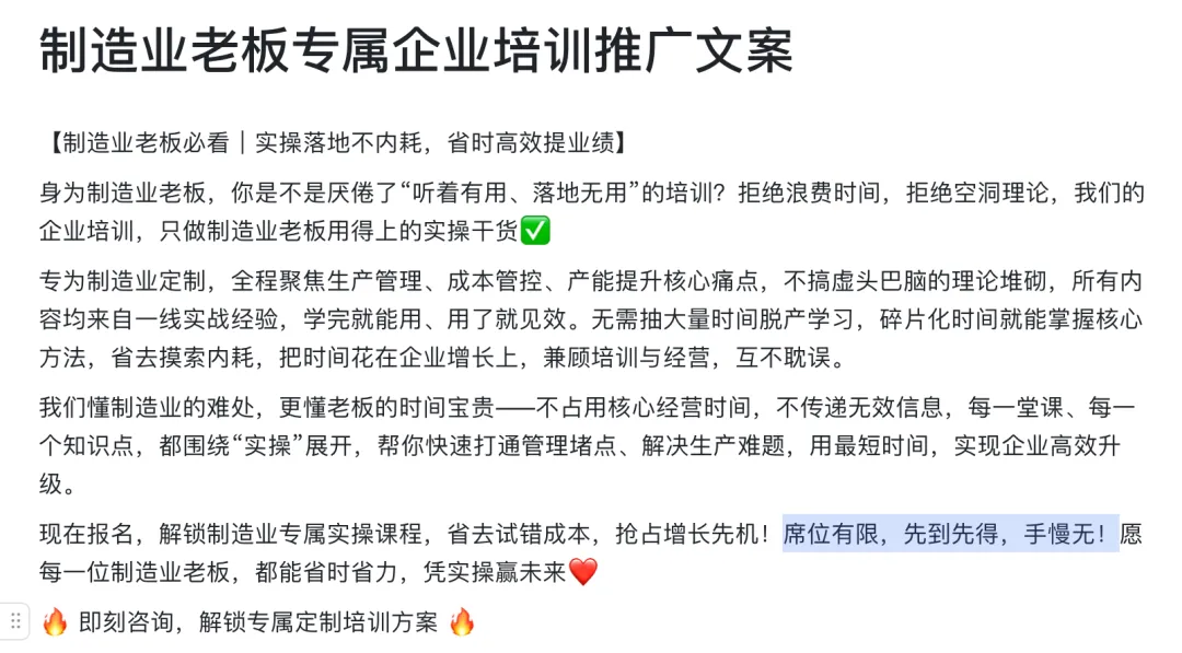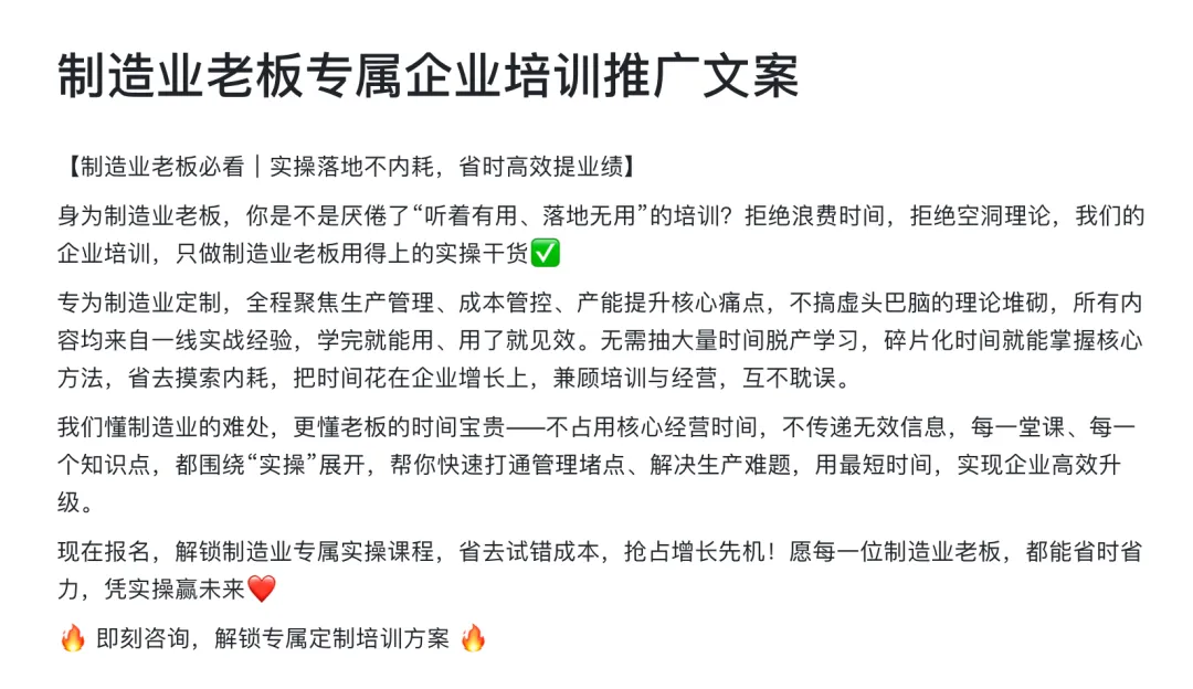 > 用户:太泛了。我们是做企业培训的,对象是制造业老板,突出“实操”和“不浪费时间”