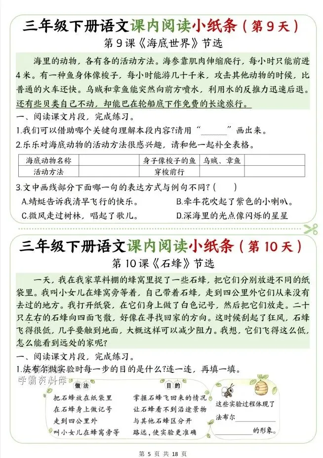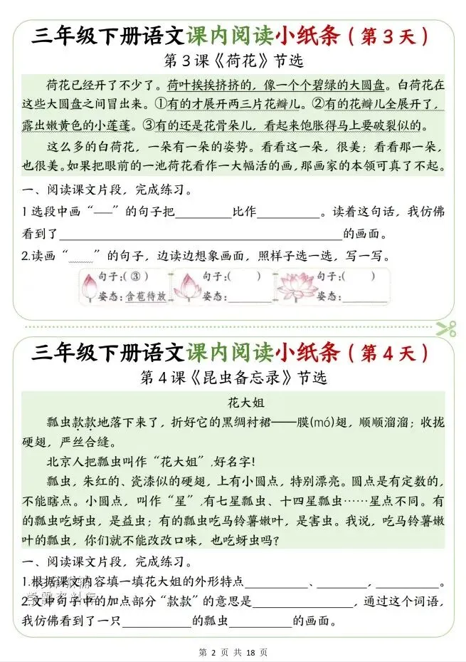 今天给大家整理了三年级语文下册课内阅读小纸条,转发给朋友或班级群,受益更多人,帮助孩子学习!