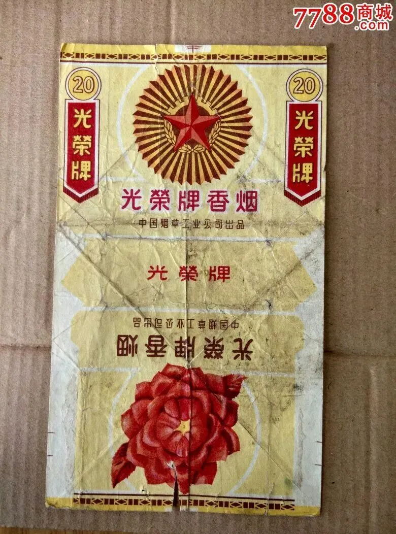 这张光荣牌烟标,纸张已经起皱了,边角也磨旧了,可恰恰是这种旧,最有生活感。上面的红花和五角星,一看就是那个年代常见的设计语言。它不是摆在展柜里的新品,而像是从谁家的抽屉、旧木箱、书本夹层里翻出来的。说实话,我看到这种有折痕的烟标,比看到保存得太新的还亲切,因为它说明,这东西真在日子里待过。