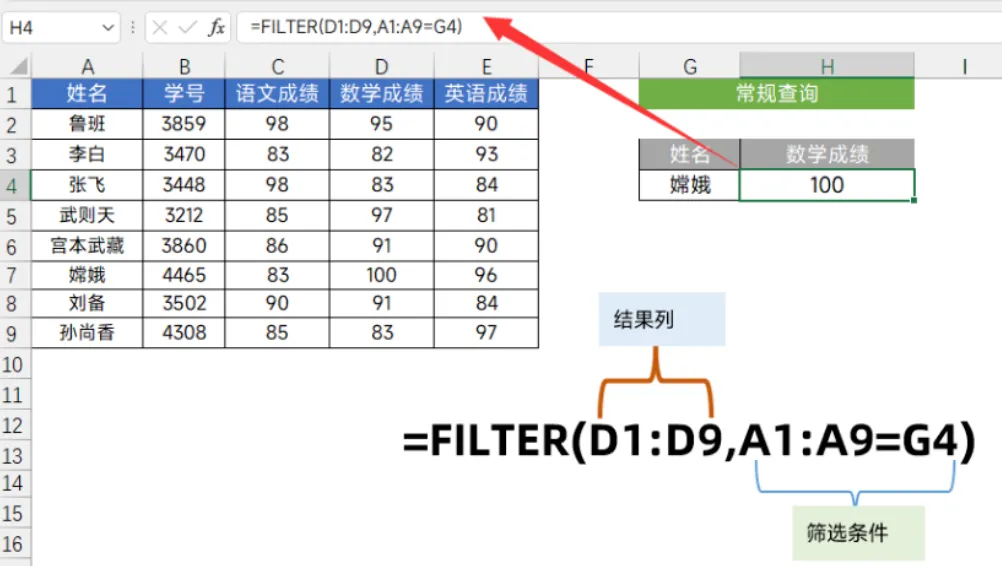 A1:A9=G4:判断姓名列里哪些等于G4里的“嫦娥” -