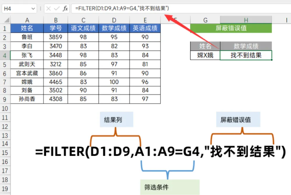 FILTER不一样,你可以自定义查不到时显示什么。比如我把查找值改成“嫦X娥”(数据里根本没有这个人):