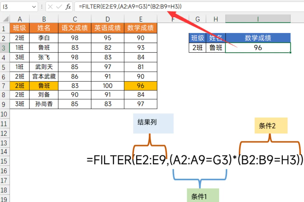 多条件查询在FILTER这里非常直观。比如我想查“2班鲁班”的数学成绩: