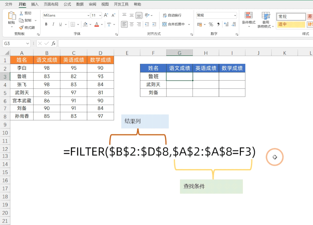 公式:=FILTER(A1:A9,B1:B9=G4)