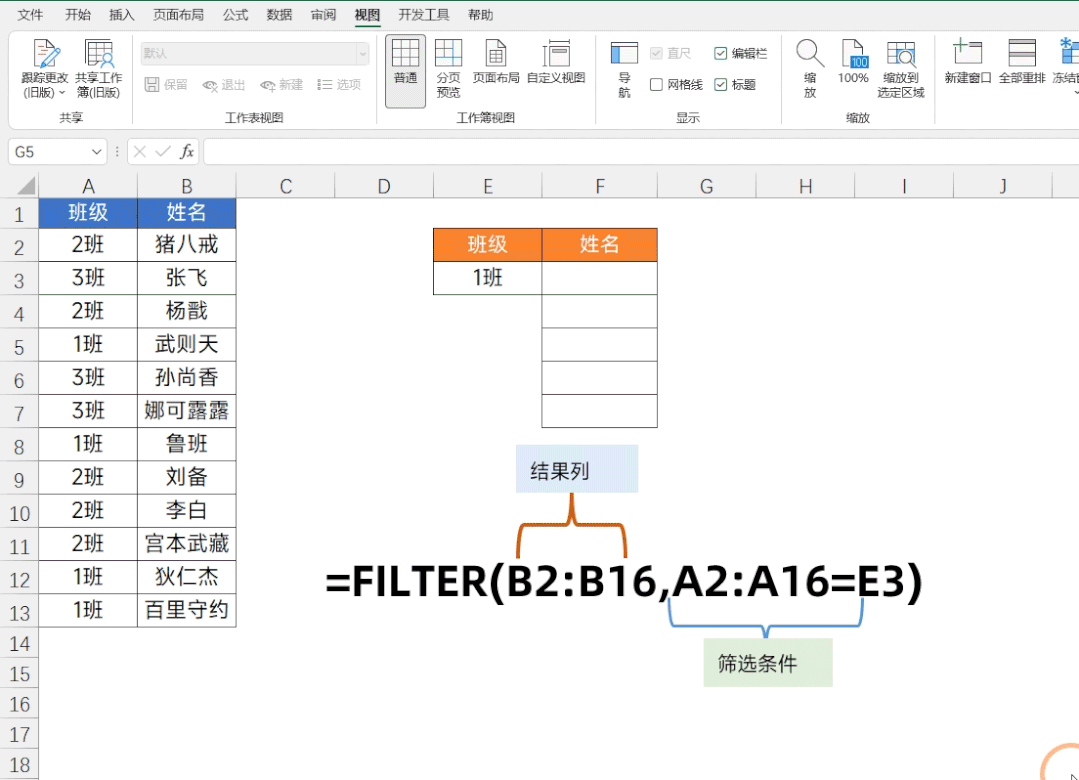A列是班级,B列是姓名,E3里写的是“1班”。所有1班的学生一次性全部列出来,不用数组公式,不用按三键。