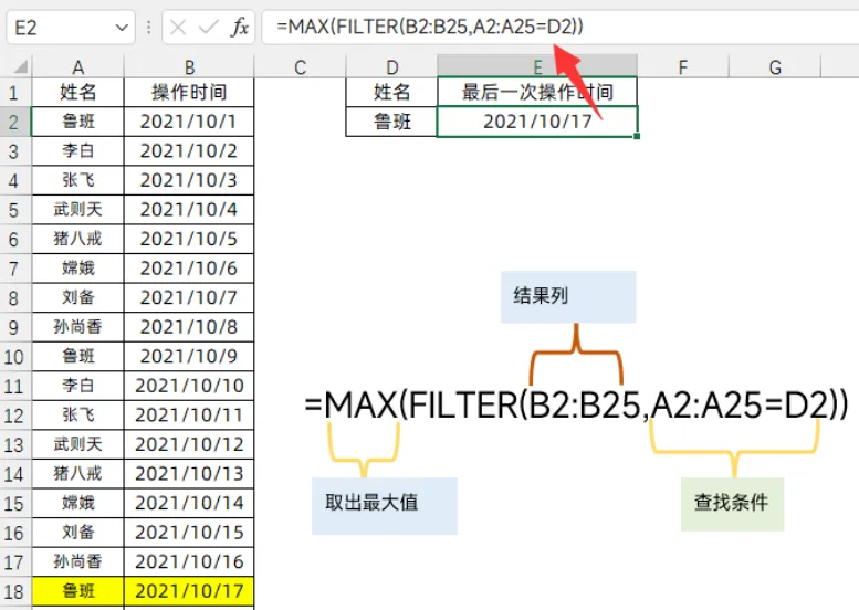 比如我想查“鲁班”最后一次操作的时间。数据表里记录了鲁班多次操作的时间,我想找出最晚的那一次: