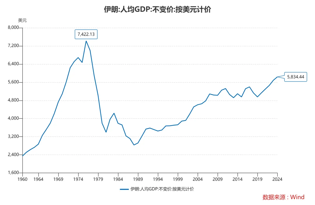 1979年伊斯兰革命成为经济发展的分水岭。革命后,国家全面掌控资源,对外封闭程度加深,经济结构更趋单一化。据世界银行数据,伊朗人均GDP(不变价美元)于1976年达到历史顶峰7422美元,但革命及随后的两伊战争重创了国民经济,人均GDP持续下滑。直至2024年,伊朗人均GDP为5834美元,仍未恢复至1976年的峰值水平。这意味着在近半个世纪的时间里,尽管经历了周期性的经济波动与短暂复苏,伊朗人均实际收入始终未能跨越革命前的高点,深刻反映了政权更迭、长期制裁与结构性问题对国家发展轨迹的持续影响。