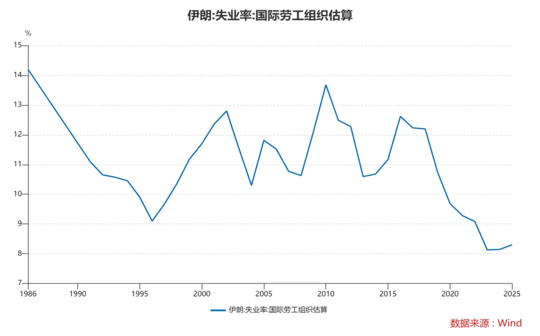 伊朗长期依赖石油产业的经济结构,对其制造业等实体经济部门形成了明显的挤压。石油产业作为典型的资本密集型行业,其吸纳就业的能力十分有限,导致国民经济享受资源红利,却无法创造充足的就业岗位。自1980年代以来,伊朗失业率长期维持在10%以上的高位,其中青年失业率长期处于20%以上,大量的普通民众被排除在石油财富的分配格局之外,未能共享资源收益。这种经济模式,加剧了社会的贫富分化,进一步激化了内部矛盾,削弱了政权的社会基础。为应对持续积累的合法性质疑与社会不满,政府日益依赖强权手段维持统治,同时通过经济利益的输送来豢养暴力机构,形成了压制与收买并行的治理逻辑。伊朗失业率数据如下: