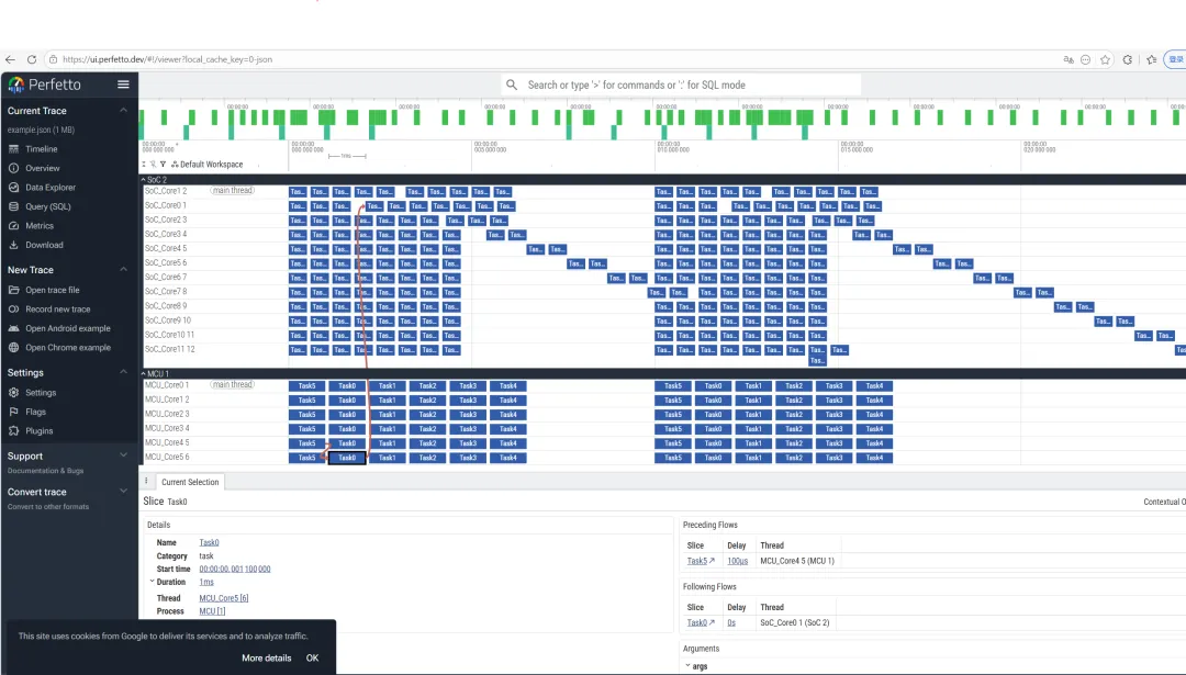 { "traceEvents": [ { "ph": "M", "pid": 1, "name": "process_name", "args": { "name": "MCU"} }, { "ph": "M", "pid": 1, "tid": 1, "name": "thread_name", "args": { "name": "Core0"} }, { "name": "Task0", "cat": "task", "ph": "X", "ts": 0, "dur": 1000, "pid": 1, "tid": 1, "args": { "priority": 5, "cpu_usage": "12%"}}, { "name": "Task1", "cat": "task", "ph": "X", "ts": 1100, "dur": 1000, "pid": 1, "tid": 1} ]}