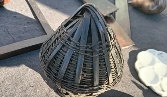 这只上尖下圆的竹编叫尖顶竹篓,篾片交叉密得很,往地上一搁就稳,样子神神秘秘的,实则好用,装鸡仔罩菜苗都行,早春天夜里凉,爸把它扣在刚出的苗上,清早揭开一圈白汽往上冒,鸡一来啄菜也挡住了,手背划过篾口有一丝细细的刺感,太阳晒久了颜色发黑发亮,现在院里多是塑料罩,轻便是轻便,扎实劲儿却差点。