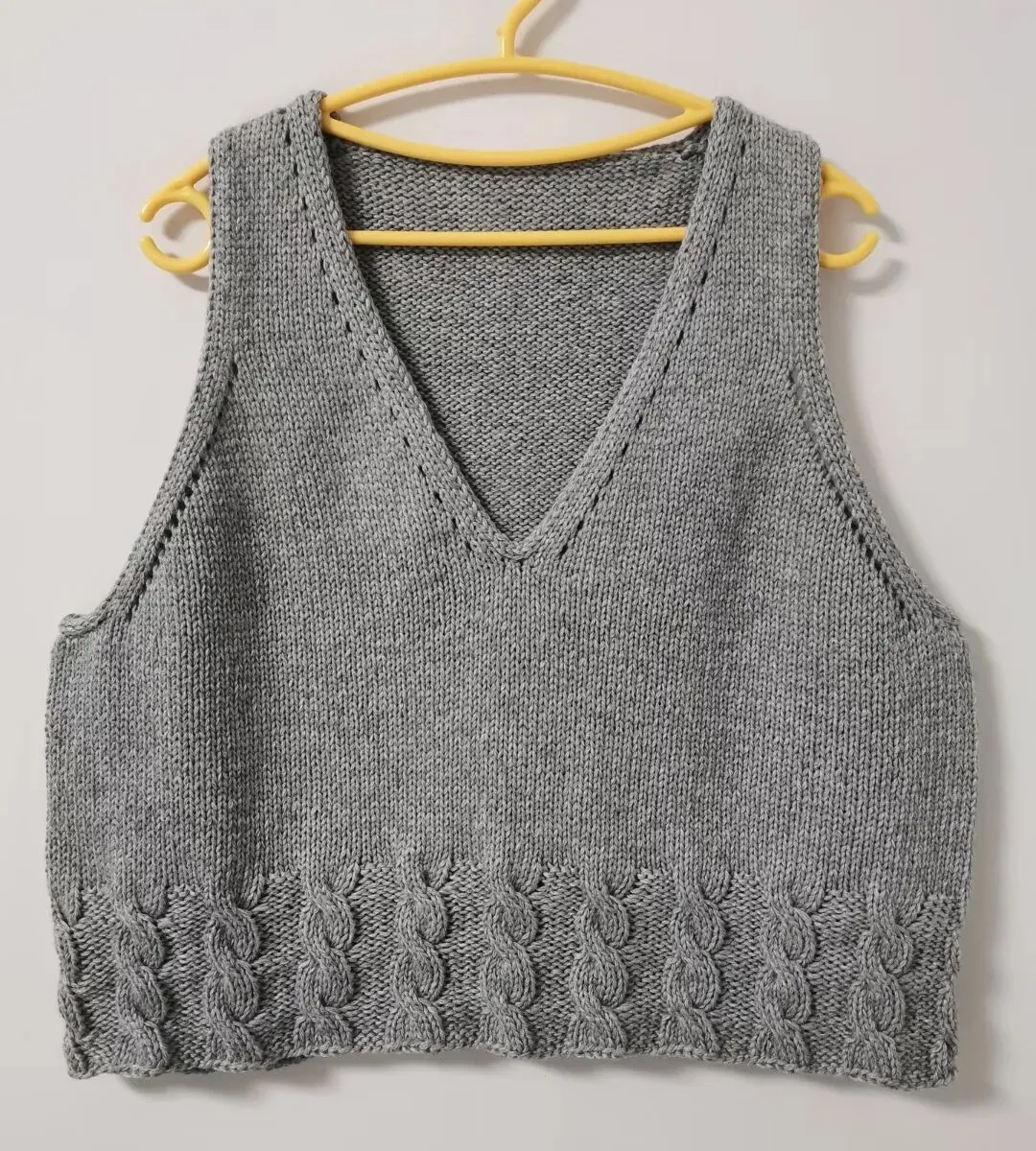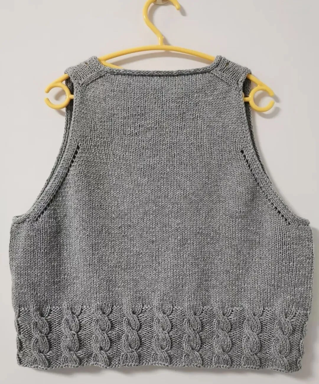 圈织:两个前片织好后进行圈织,V领处加1针,腋下各加11针,织40行平针后再织小麻花(4上,6下),绞3次麻花后平收