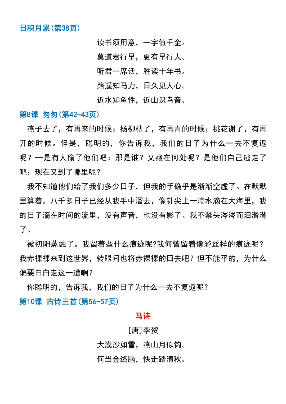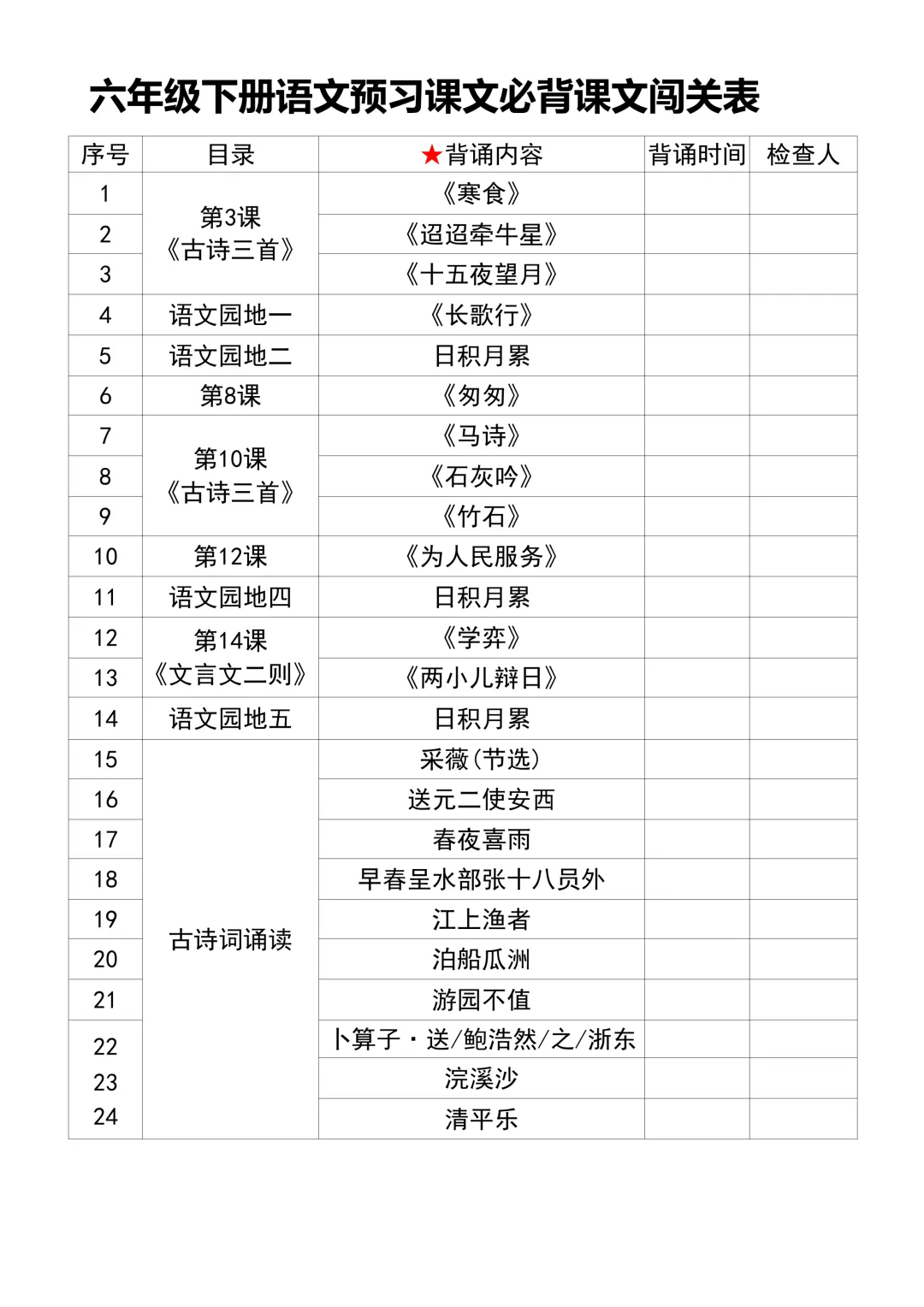 各位家长们,新学期为大家推荐《新版小学语文六年级下册必背课文闯关表》,紧扣六年级下册语文课本核心背诵要求,涵盖 24 项必背内容(古诗、文言文、经典课文、日积月累、古诗词诵读等),适配小升初阶段的语文积累与备考需求。资料完整呈现《匆匆》《为人民服务》等重点课文、《学弈》《两小儿辩日》等文言文,以及《寒食》《石灰吟》《竹石》等经典古诗,还包含多组日积月累格言、谚语与 10 首古诗词诵读篇目。内容兼顾基础积累与深度理解,既帮助孩子夯实语文背诵功底、提升文言素养与语感,又能积累写作素材、深化文化认知,闯关表形式清晰直观,方便跟踪背诵进度、规划积累计划。适配日常背诵练习、单元复习与小升初备考,是高效完成背诵任务、提升语文核心素养的实用资料。