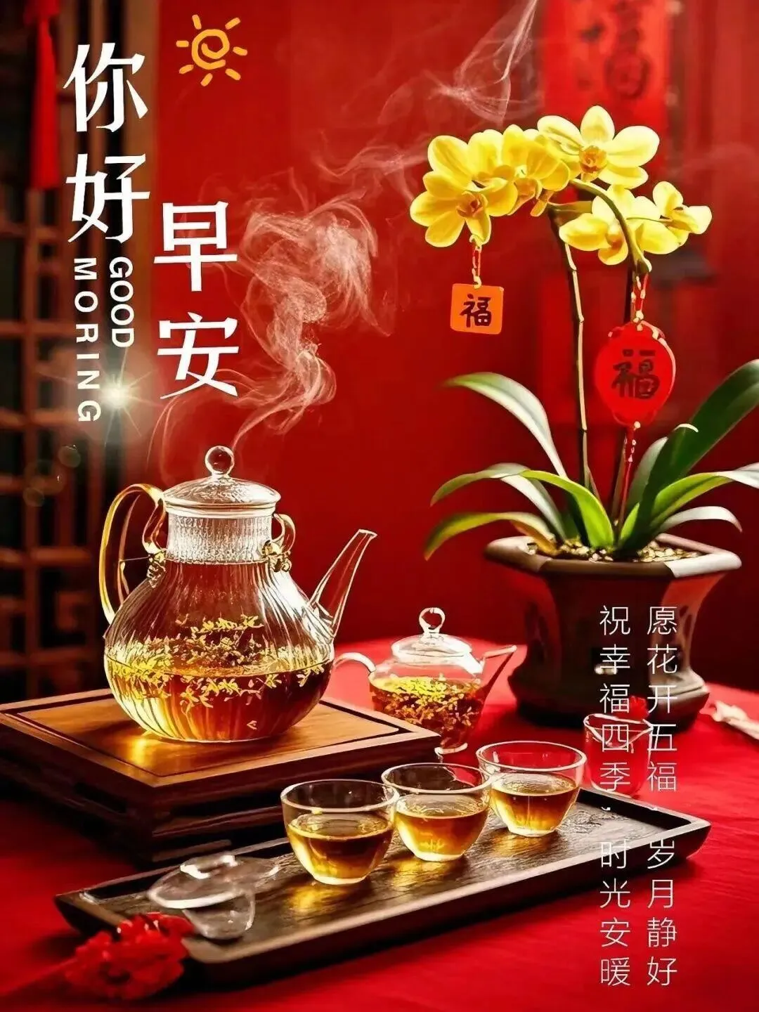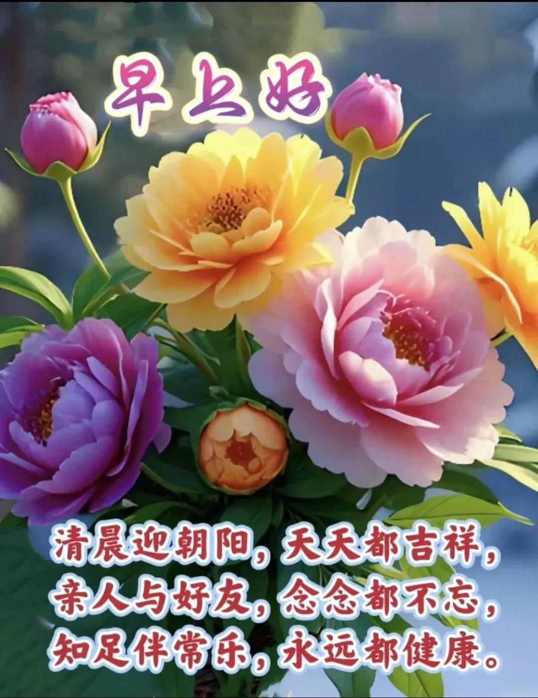 清晨祝福似暖阳,健康幸福伴身旁,新的一天新气象,愿你每天都安康。岁月静好心舒畅,开心快乐无忧伤。祝福满满心意长,笑容灿烂映朝阳。大家早上好!