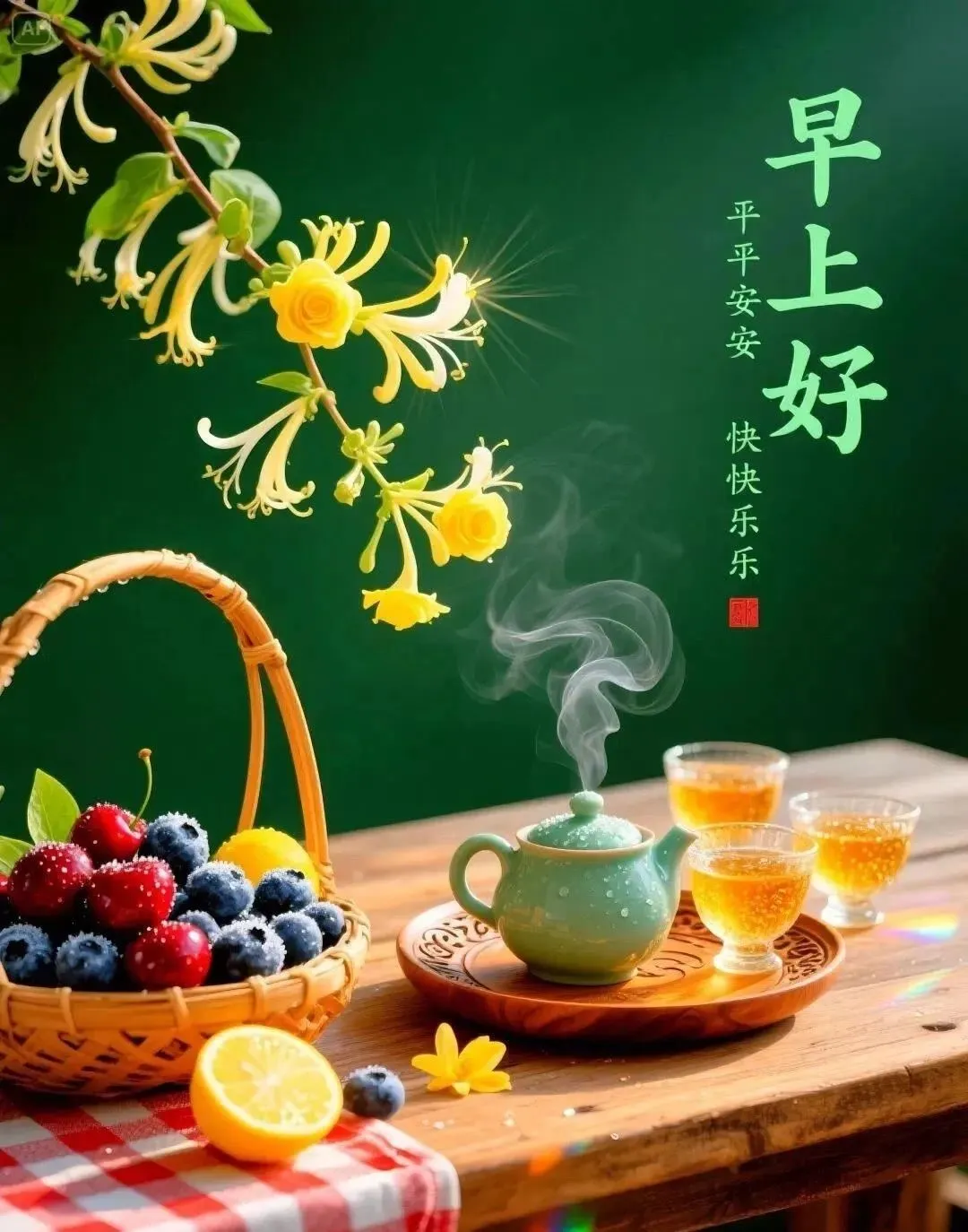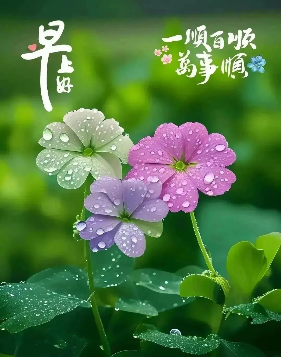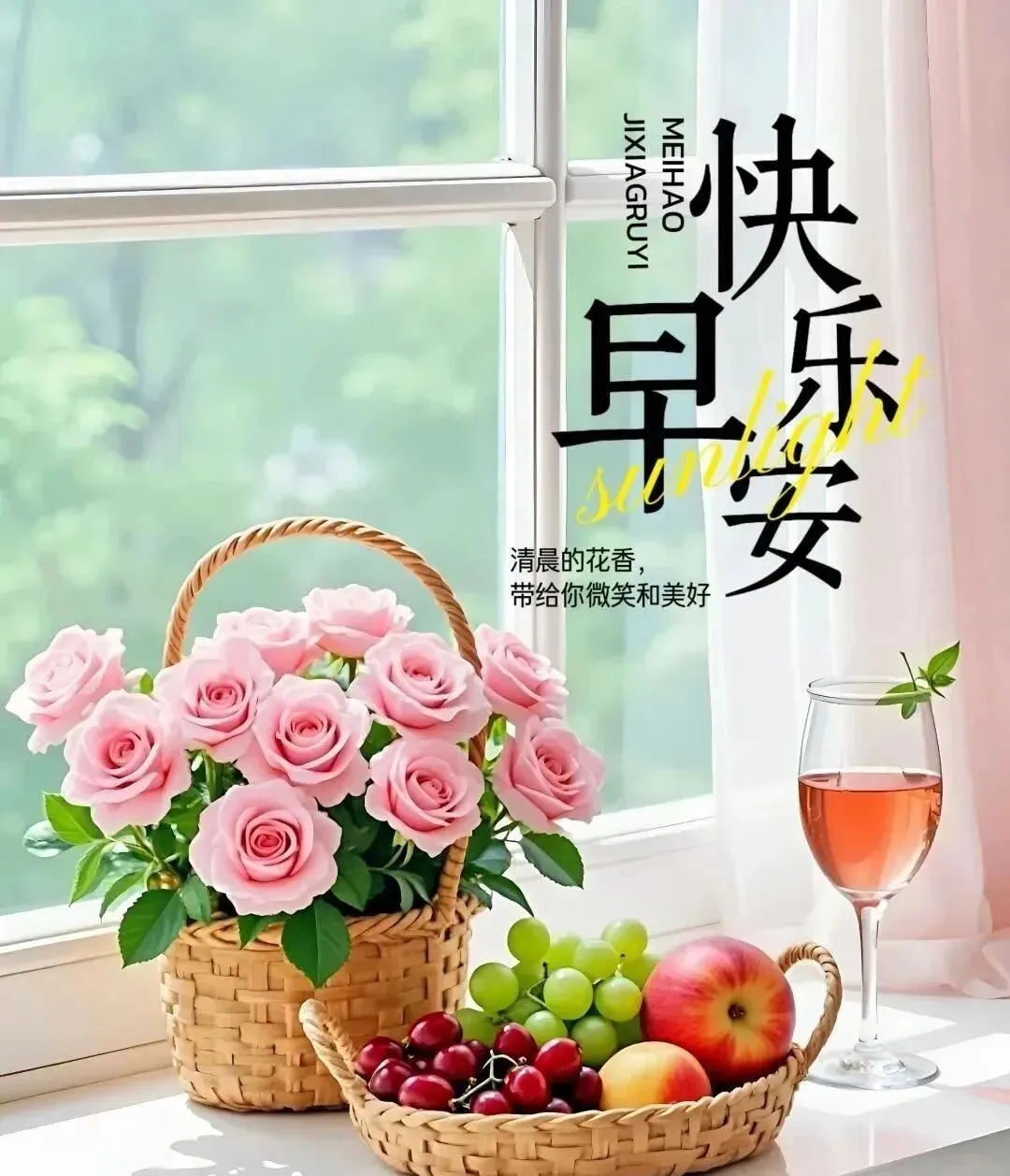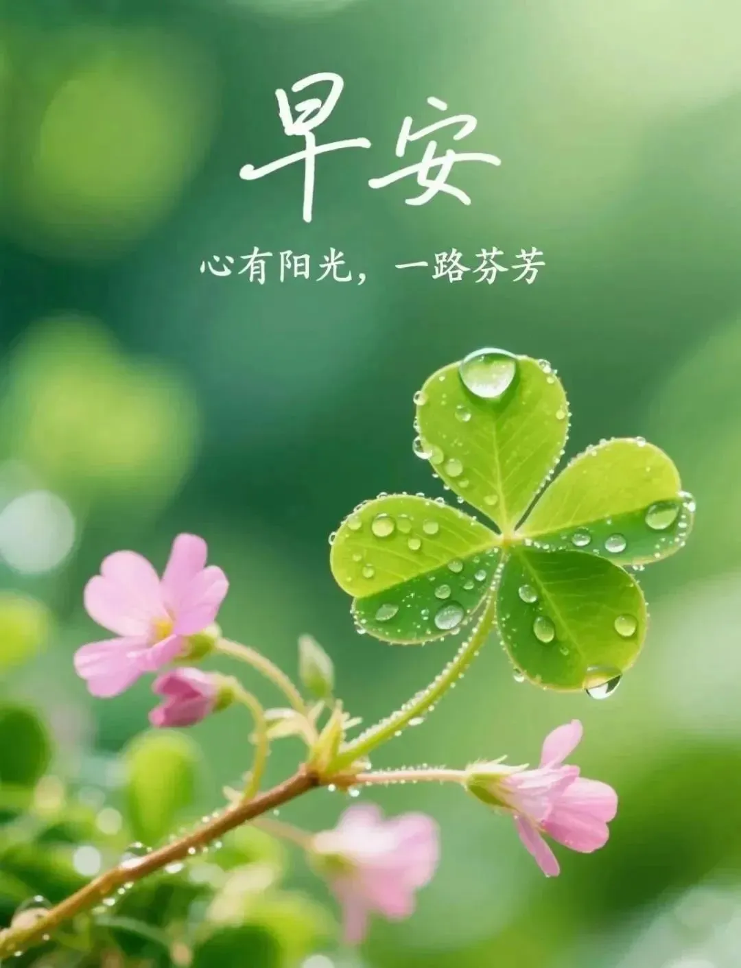 清晨到,清晨早,清晨送你灵丹妙药,晨鸣声声,清头脑,晨光满面,精神好;晨风拂来,烦恼消;晨露闪闪,信心到,愿你每天乐逍遥,早安。