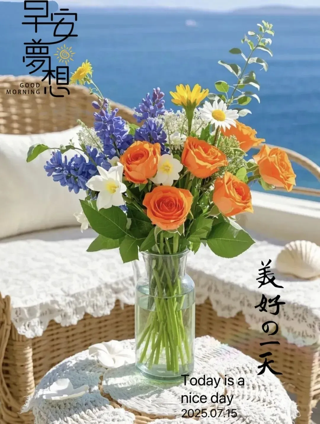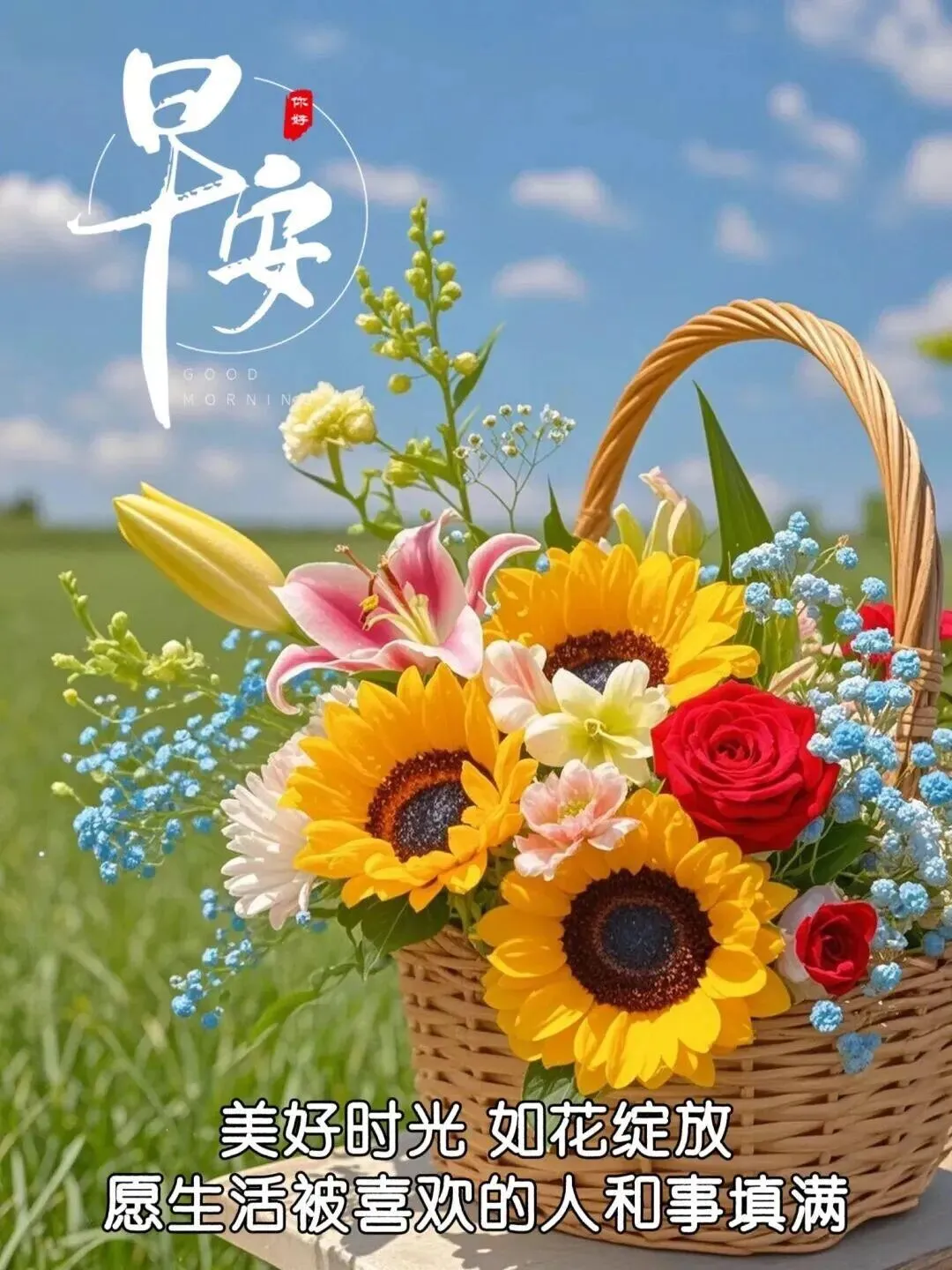 愿你今天的心情,像蓝天一样明朗;愿你今天的生活,像花开一样芬芳;愿你今天的脚步,像风一样轻盈;愿你今天的笑容,像阳光一样灿烂。大家早安!🌞🌸🌿