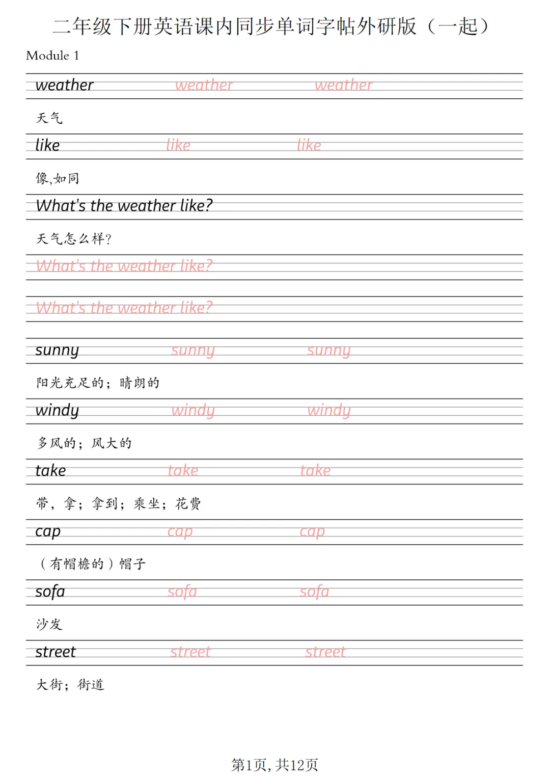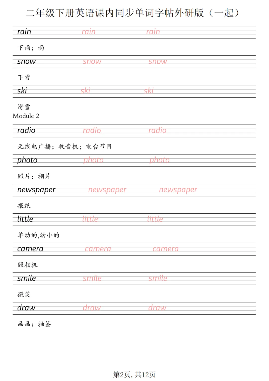 【免费下载】二年级(下)英语 课内同步单词字帖《外研版(一起)》,PDF电子版,可打印